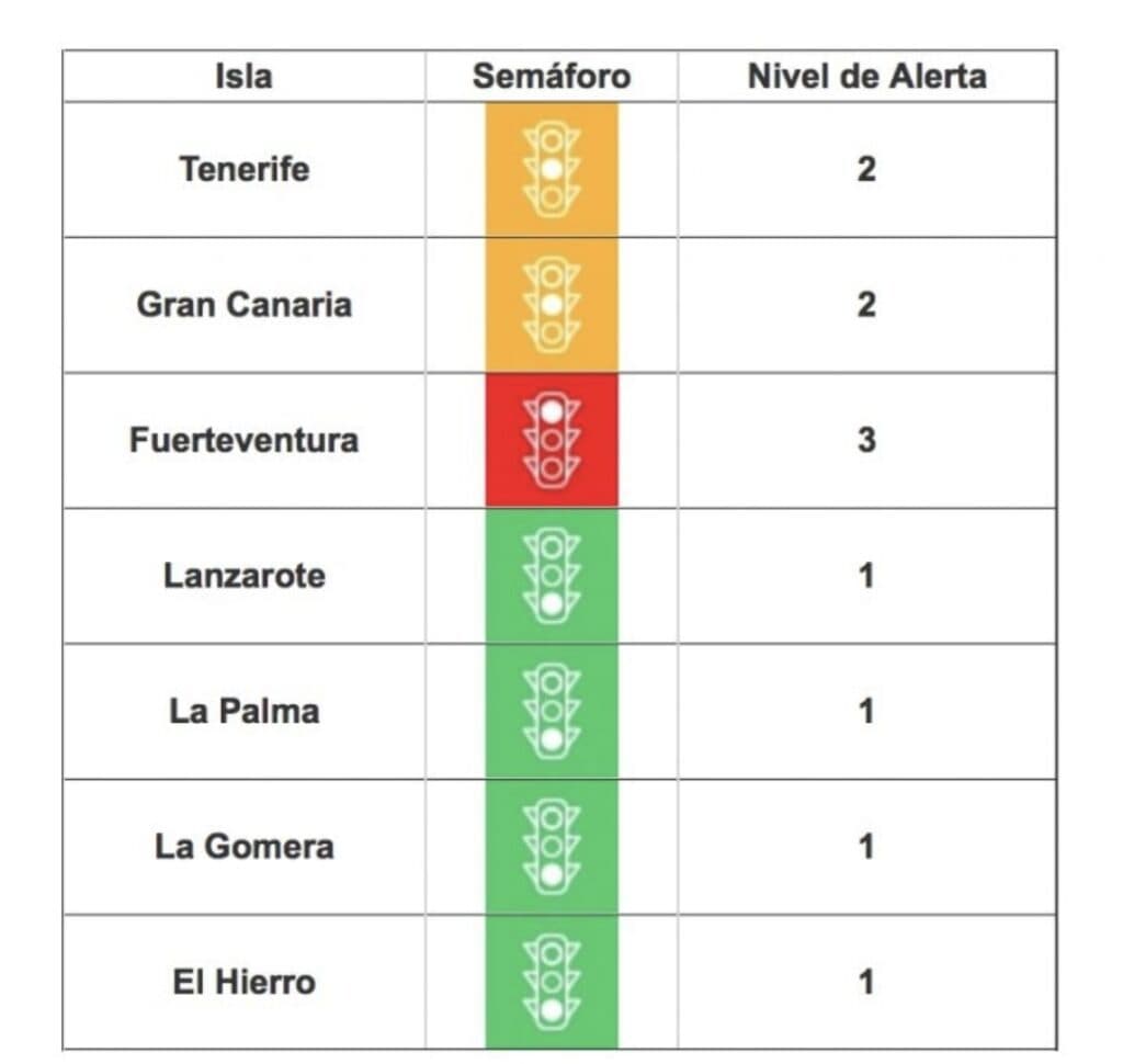 De esta forma, el conocido semáforo de niveles queda de la siguiente manera: Fuerteventura, nivel 3; Gran Canaria y Tenerife, nivel 2; Lanzarote, La Palma, La Gomera y El Hierro, nivel 1. Este cambio tendrá lugar a las 00.00 horas de este viernes, 17 de septiembre, tras la publicación del conocido semáforo en la web de la Consejería de Sanidad.