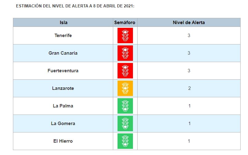 Los niveles de alerta en que se encuentran las islas, así como la fecha de vigencia establecida para las citadas medidas en cada una de ellas se indican a continuación: