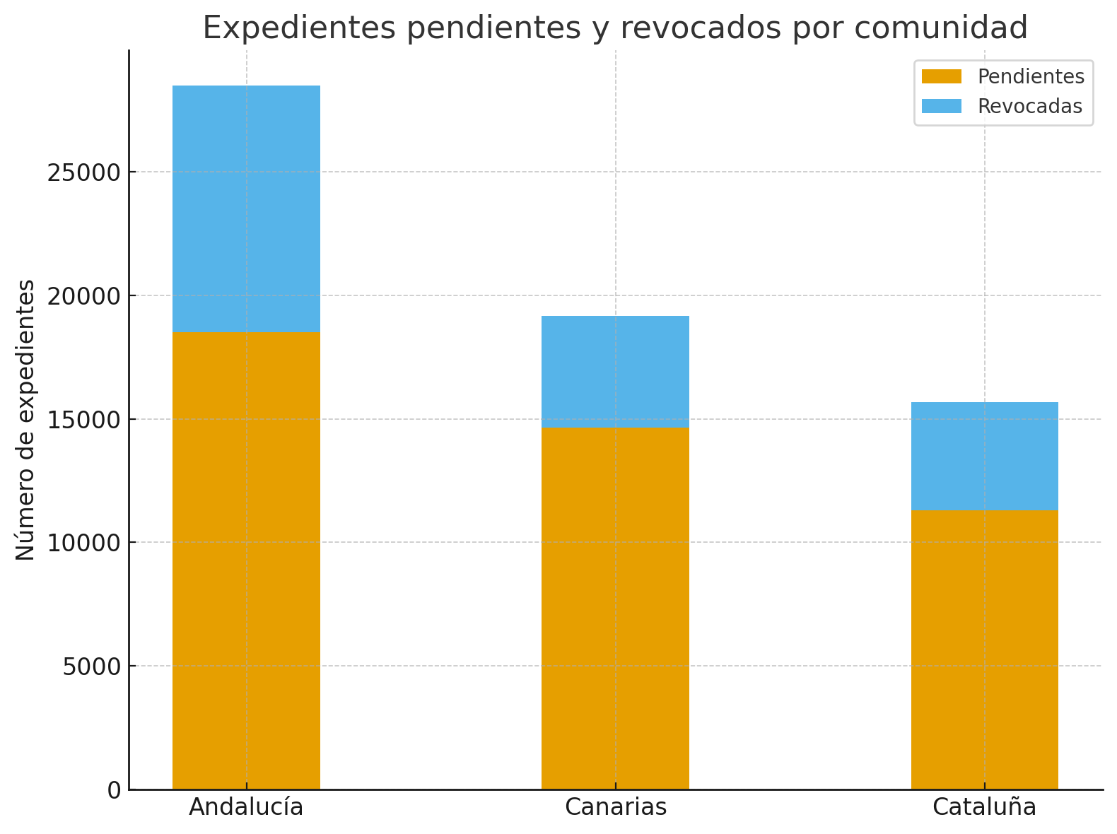 Un gráfico comparativo con Andalucía y Cataluña muestra que Canarias es uno de los territorios con más volumen de expedientes aún por resolver, con más de 14.600 casos abiertos frente a los 18.492 de Andalucía y los 11.311 de Cataluña. Esta situación genera una fuerte presión sobre los registros y, al mismo tiempo, inquietud en los operadores locales.