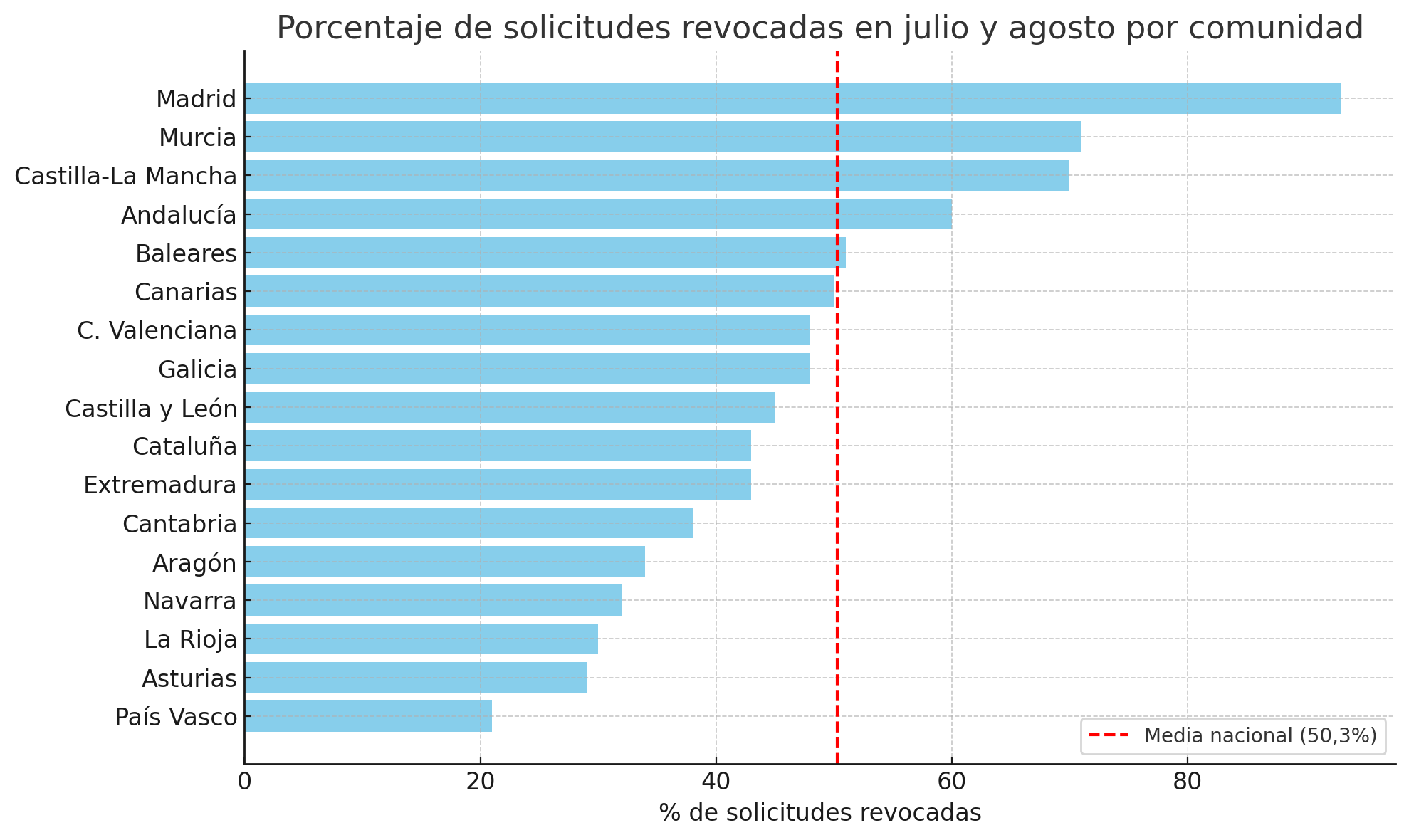 En la tabla de comunidades autónomas difundida por el Ministerio, Canarias aparece con un 50% de rechazos, en línea con la media nacional, aunque por debajo de territorios como Madrid (93%) o Murcia (71%), pero por encima de Cataluña (43%) y del País Vasco (21%).