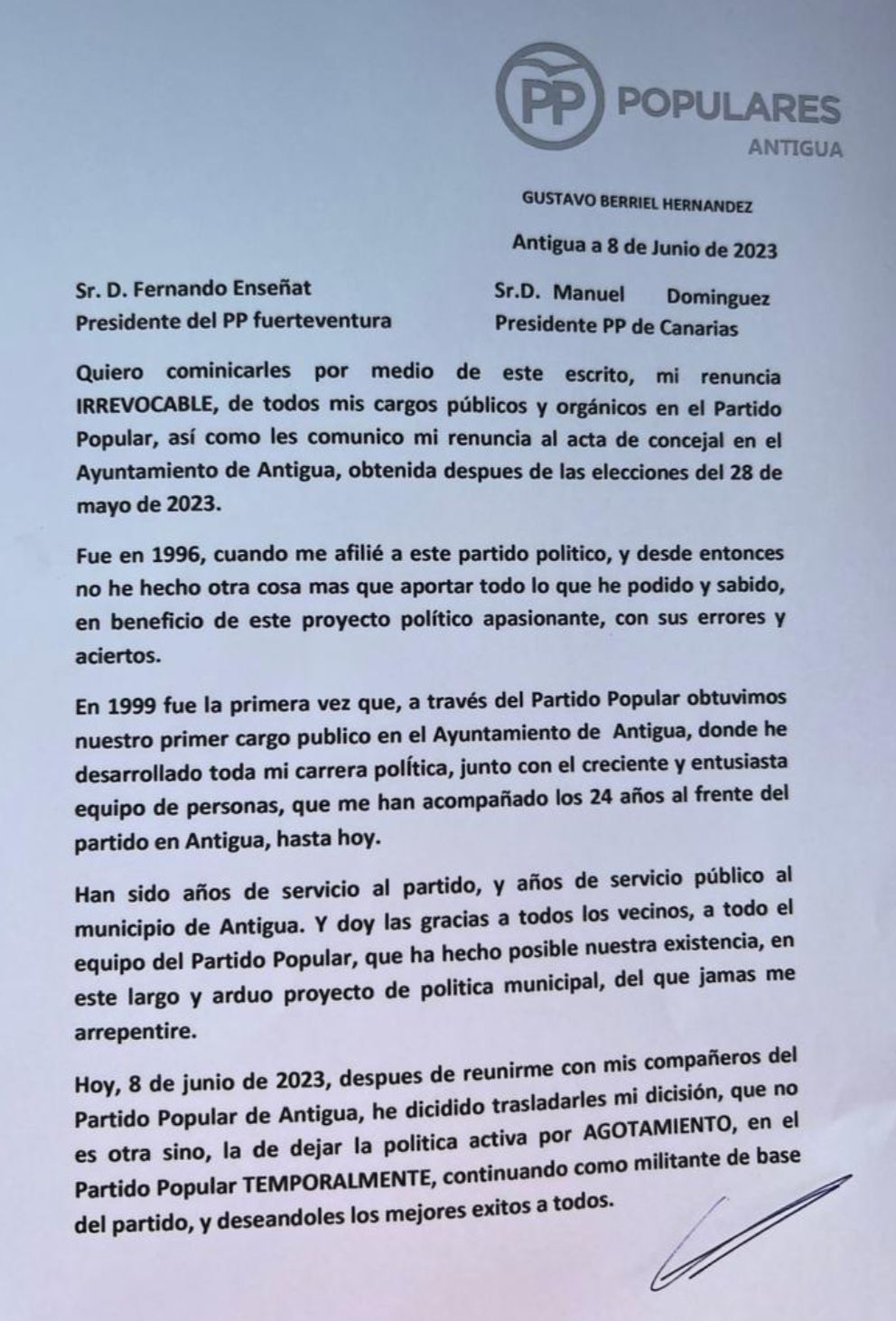 En la carta asegura que «hoy, 8 de junio de 2023, después de reunirme con mis compañeros del Partido Popular de Antigua, he decidido trasladarles mi decisión, que no es otra sino, la de dejar la política activa por «agotamiento», en el Partido Popular «temporalmente», continuando como militante de base del partido, y deseándoles los mejores éxitos a todos».