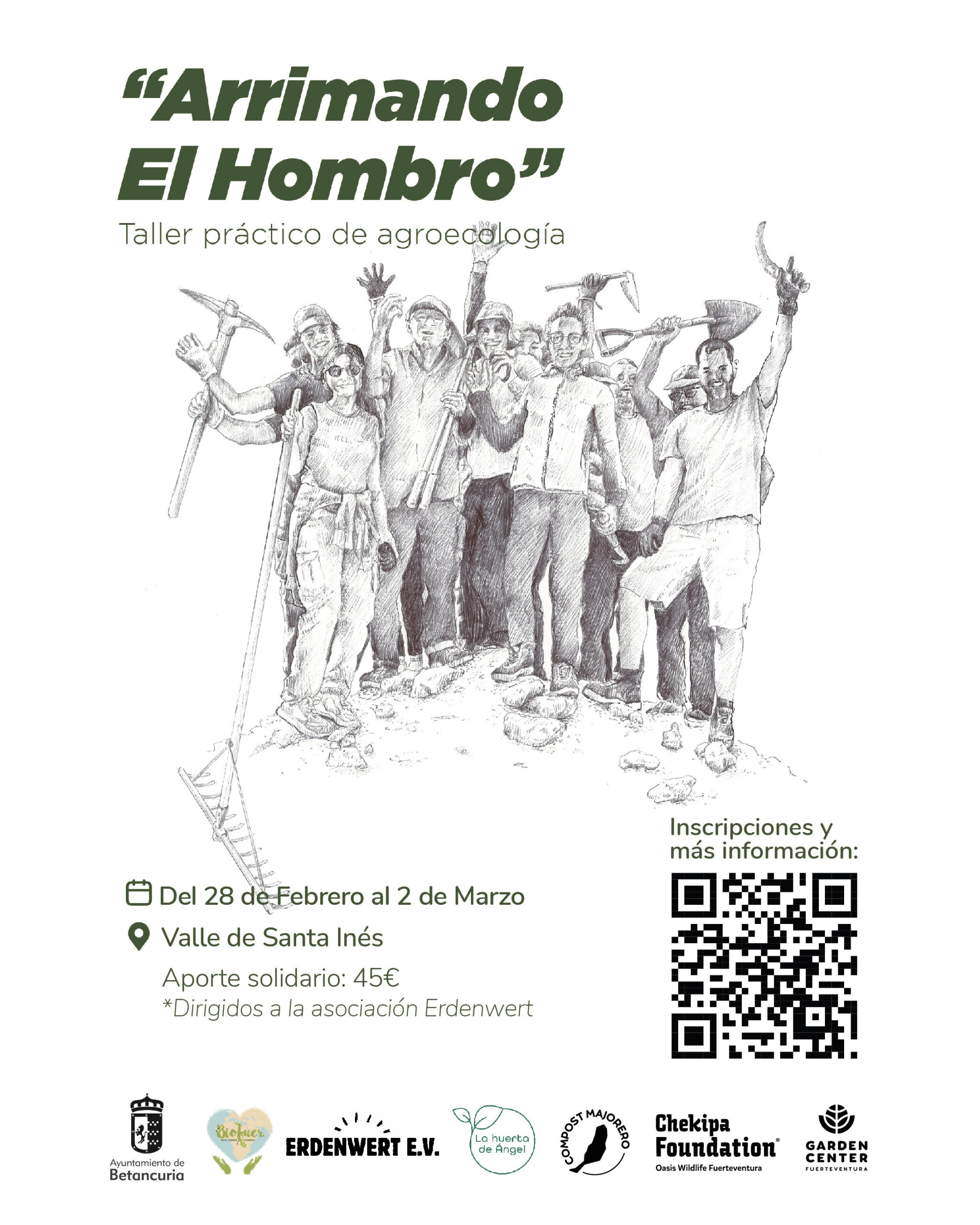 La Asociación Medioambiental Erdenwert y la Fundación Chekipa, en colaboración con Compost Majorero, Garden Center, el Ayuntamiento de Betancuria, La Huerta de Ángel y Biofuer, organizan el taller agroecológico «Arrimando el hombro», que se desarrollará del 28 de febrero al 2 de marzo en distintas fincas de la isla. La iniciativa busca ofrecer estrategias prácticas para recuperar la fertilidad del suelo y optimizar los cultivos en Fuerteventura, una isla con condiciones climáticas desafiantes para la agricultura.