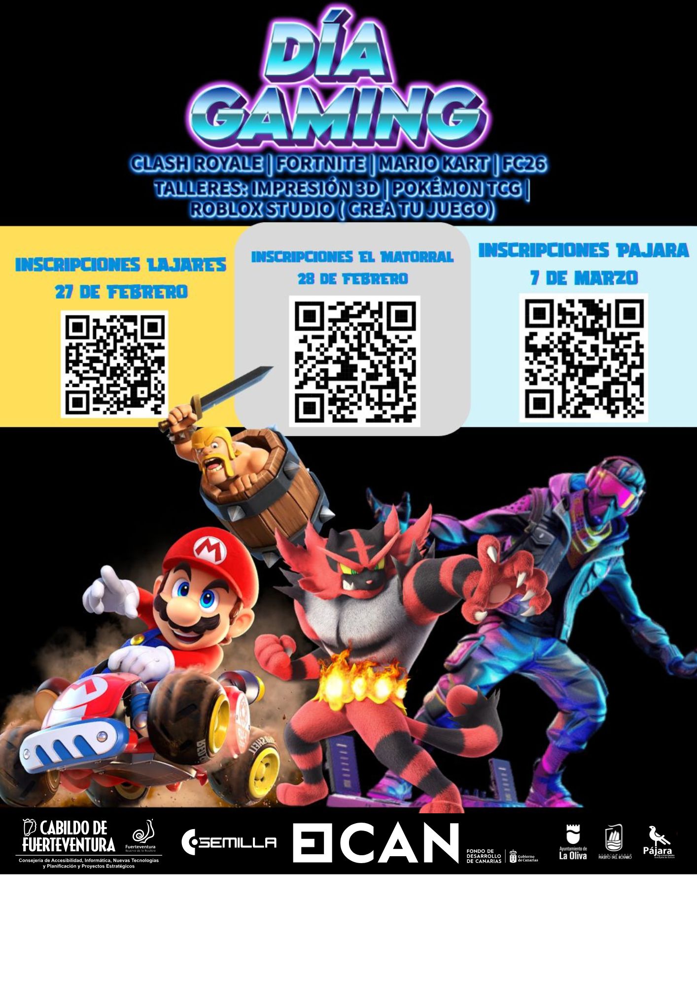 Como inicio del proyecto, el Cabildo organiza varias jornadas “Día Gaming” abiertas al público juvenil, familias y personas aficionadas a los videojuegos. Estos encuentros combinarán competiciones de Clash Royale, Fortnite, Mario Kart y FC24 con talleres de impresión 3D, Pokémon TCG y Roblox Studio para crear juegos propios. Los primeros eventos confirmados se desarrollarán en el Centro Cultural de Lajares el viernes 27 de febrero, en el Centro Cultural de El Matorral el 28 de febrero, y en la Casa de la Juventud de Morro Jable el sábado 7 de marzo.