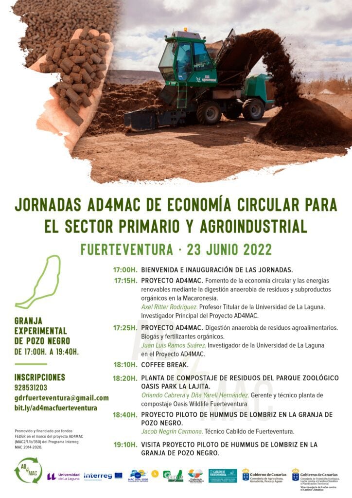 Se dará a conocer el proyecto AD4MAC, que pretende fomentar la economía circular y la producción de energía renovable en las empresas e industrias agroalimentarias de la región macaronésica, mediante la correcta gestión de los residuos y subproductos orgánicos. Este proyecto se enmarca en el Programa Interreg Mac 2014-2020 (Fondos FEDER).