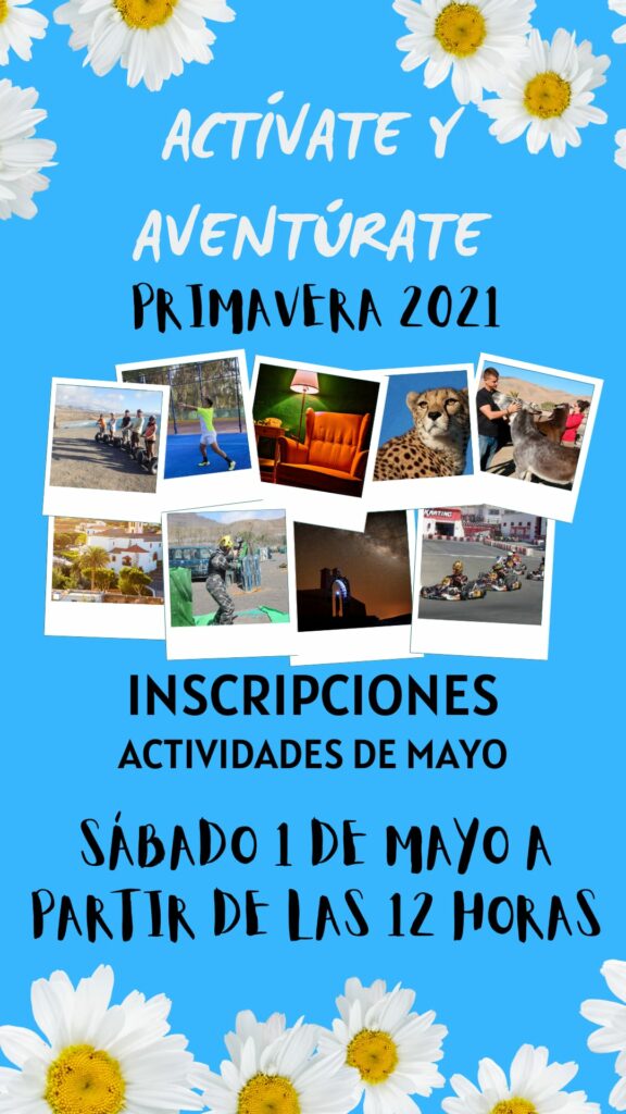 La Consejería de Educación y Juventud del Cabildo de Fuerteventura, que dirige María Saavedra Hierro, reabre las inscripciones de Actívate Primavera para el mes de mayo. Tras el éxito obtenido en esta iniciativa durante el mes de abril, en la que más de 200 jóvenes participaron en las siguientes actividades organizadas: Segway, Pádel tenis, Scape Room, visita a The Animal Academy, y visitas al Oasis Wildlife Fuerteventura. Esta programación de ocio y tiempo libre, que se extenderá hasta 13 de junio, es de carácter gratuito y está dirigida a jóvenes de 14 a 35 años.