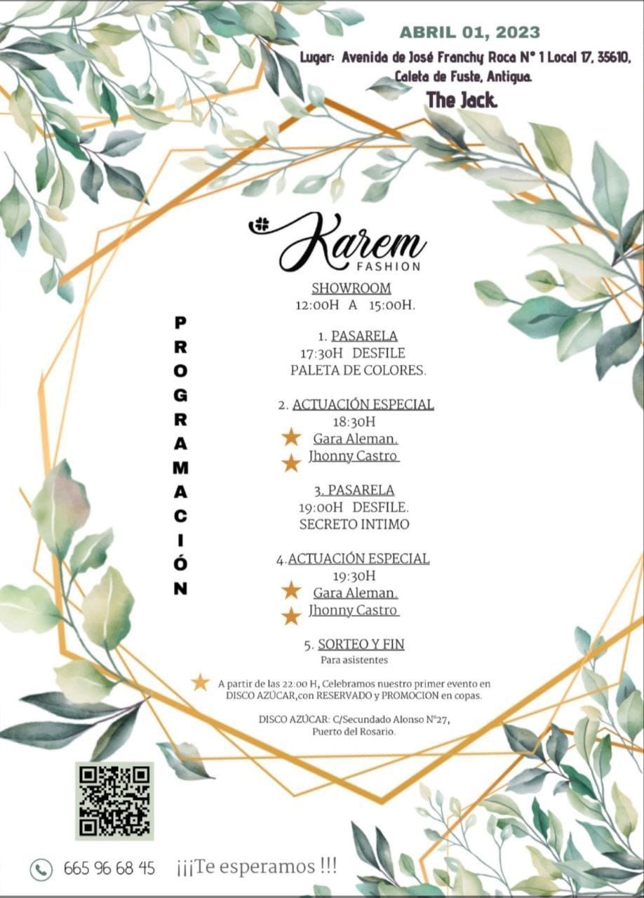 Una jornada para poder descubrir las tendencias para esta primavera-verano de 2023, con venta directa de las nuevas colecciones, pasarela con «modelos reales» y actuaciones musicales. El fin de fiesta se trasladará a Disco Azúcar en Puerto del Rosario.