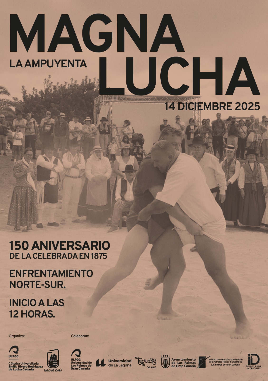 El acto central, “Magna. La Ampuyenta”, se celebrará el domingo 14 de diciembre, a partir de las 12:00 horas, en la propia “gavia de la lucha”, un espacio emblemático del municipio. Cincuenta luchadores recrearán la estructura de la luchada original, divididos en los bandos Norte y Sur de Fuerteventura, siguiendo fielmente el ritual del siglo XIX. Los mandadores serán Carmelo Padilla, al frente del combinado Norte, y Jorge Ávila, dirigiendo al Sur.