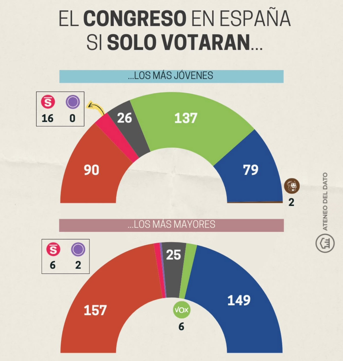 Una reestimación demoscópica difundida por el colectivo Ateneo del Dato ha puesto sobre la mesa un ejercicio tan simple como revelador: cómo quedaría el Congreso de los Diputados si en España votaran únicamente los electores más jóvenes o, por el contrario, solo los más mayores. El resultado dibuja dos cámaras prácticamente irreconocibles entre sí y refuerza la idea de una brecha generacional en el comportamiento político.