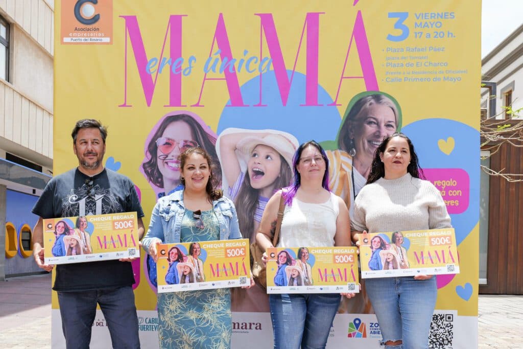 Este viernes se llevó a cabo la entrega de los cuatro cheques de 500 euros a los ganadores del sorteo de la campaña comercial ‘Mamá eres única’. Esta iniciativa, fue impulsada por el Ayuntamiento de Puerto del Rosario, a través de la Concejalía de Comercio, en colaboración con la Asociación de Empresarios de Puerto del Rosario, con motivo del Día de la Madre celebrado el pasado domingo.