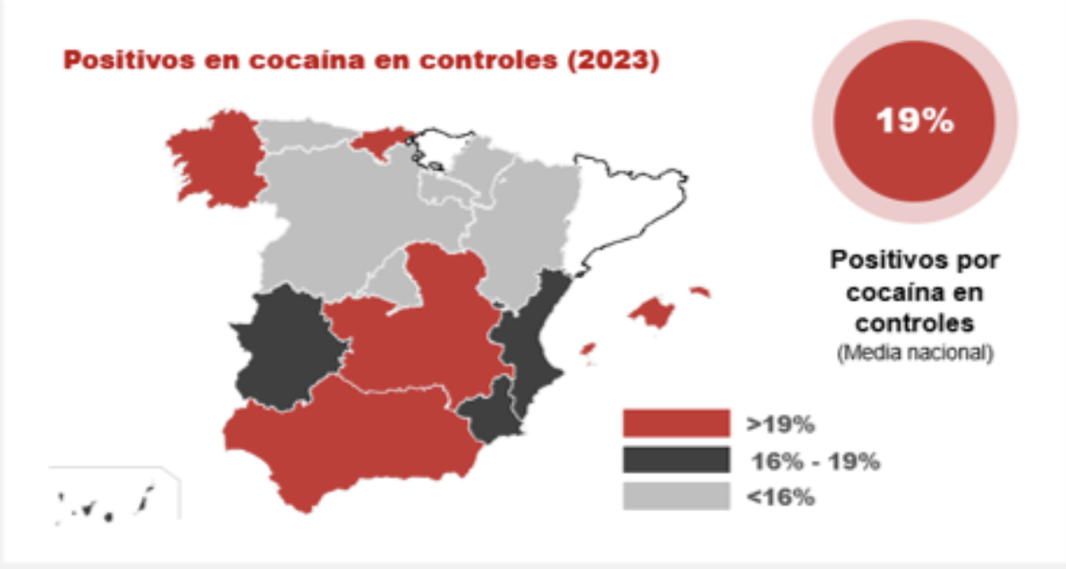 Según el instituto Nacional de Toxicología y Ciencias Forenses, el 13% de los fallecidos en accidente de tráfico en 2022 dieron positivo en cocaína, una cifra que en los últimos diez años ha aumentado un 54%. La cocaína es la segunda sustancia psicoactiva más detectada en los controles de drogas realizados por la Guardia Civil, con un 19% de positivos de media nacional en 2023.