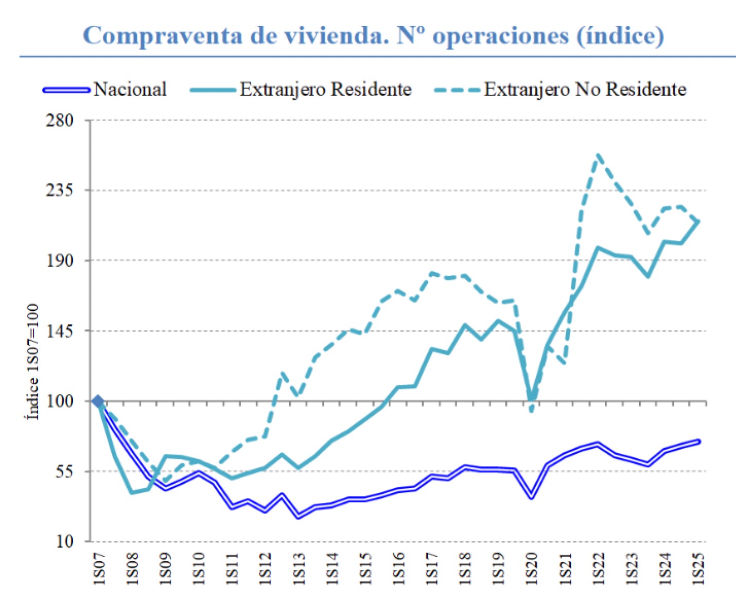Los extranjeros residentes concentraron el 60,9 % de las operaciones —un 6,4 % más que el año anterior— mientras que los no residentes redujeron su participación al 39,1 %, con un descenso del 4,1 %. Este cambio responde al fin de las golden visa y a las nuevas medidas fiscales que desincentivan la compra por parte de no residentes.
