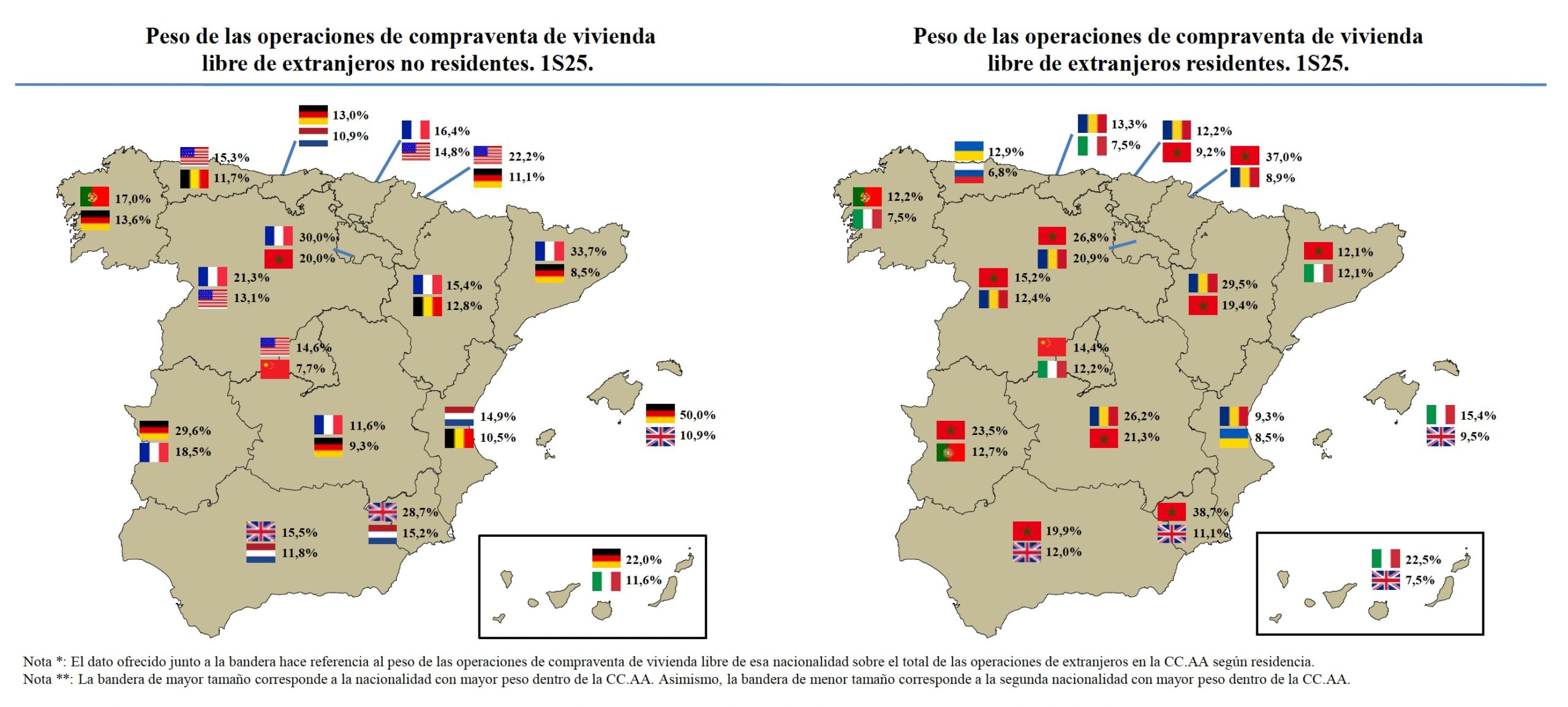 Por nacionalidades, los británicos lideraron el ranking con 5.731 operaciones (8,1 % del total), seguidos por los marroquíes (5.654) y los alemanes (4.756). En Canarias, los alemanes mantienen un papel destacado en el mercado de no residentes, representando el 22 % de las compras de este grupo, mientras que los italianos concentran el 22,5 % de las adquisiciones entre los residentes.