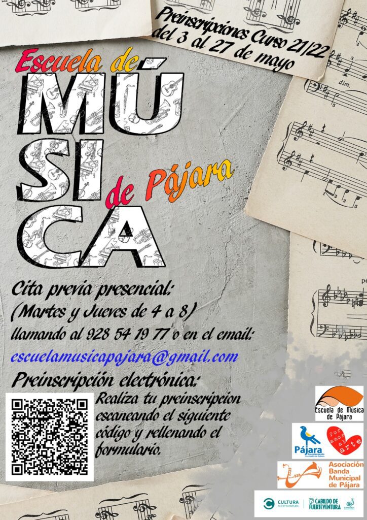 Asimismo, la preinscripción se podrá llevar a cabo de forma presencial, solicitando cita previa, los martes y jueves, en horario de 16:00 a 20:00 horas, llamando al 928 54 19 77 o a través del correo electrónico escuelamusicapajara@gmail.com.