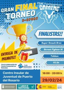 El próximo jueves 29 de febrero el Centro Insular de Juventud de Fuerteventura será la sede de a Gran Final del Torneo de E-Sports organizado por el PFAE Fuerteventura Gaming. Un total de 16 finalistas de distintos puntos de la Isla se preparan para competir en los cuatro juegos presentes en el torneo: EA Sports FC 24 (PlayStation), Super Smash Bros (Nintendo Switch), Street Fighter VI (PlayStation) y Tekken VII (PlayStation).