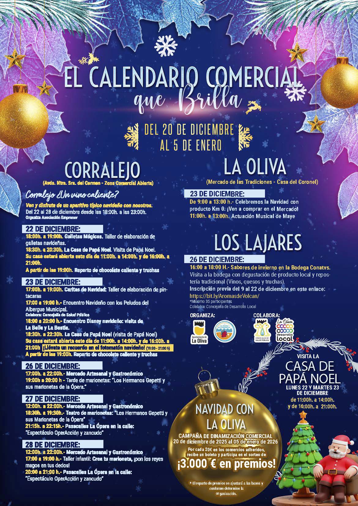 El Ayuntamiento de La Oliva ha presentado la programación especial de la Navidad 2025 bajo el nombre “Navidad con La Oliva”, una campaña de dinamización comercial y actividades familiares que se desarrollará del 20 de diciembre al 5 de enero con el objetivo de fomentar las compras de proximidad y apoyar al pequeño comercio del municipio.