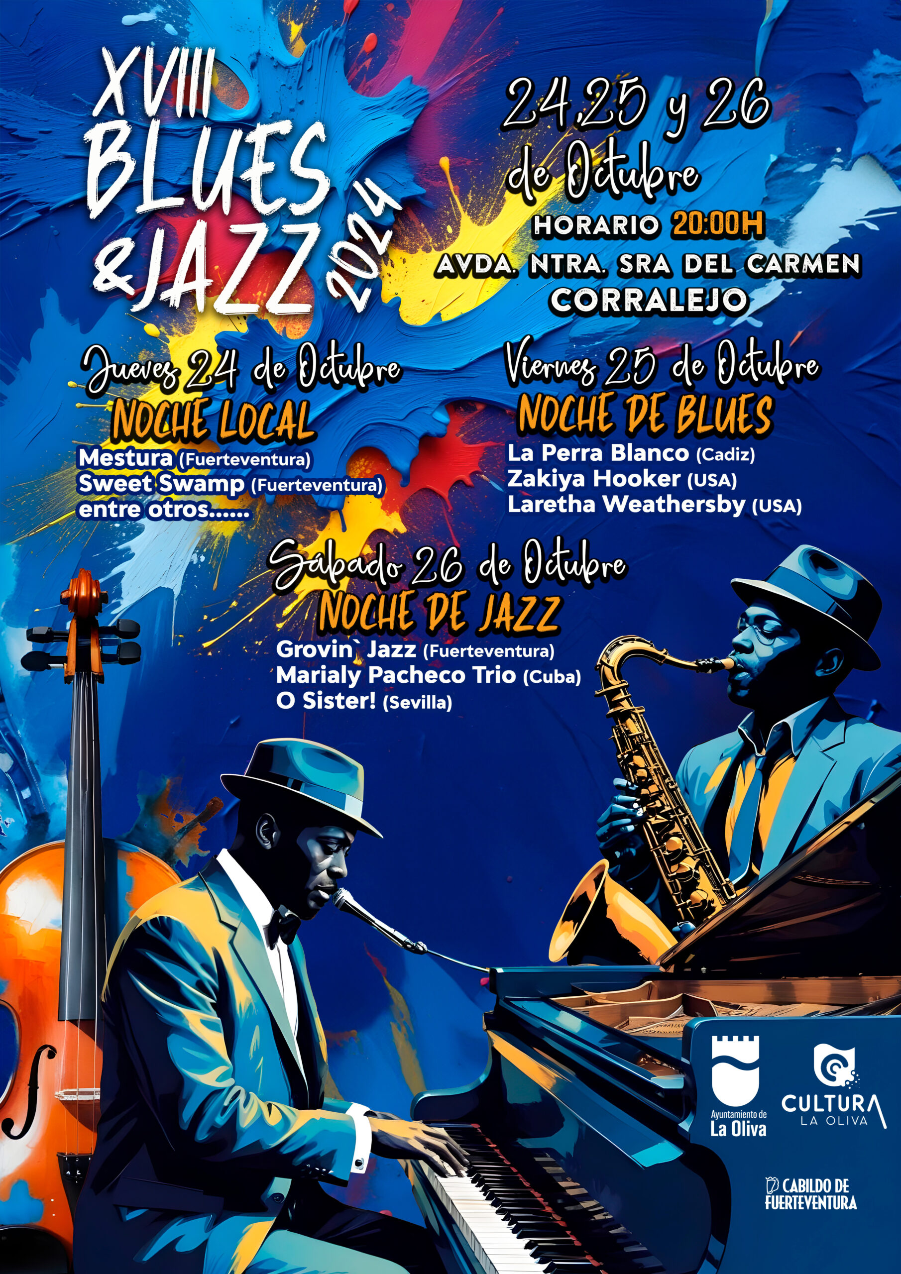 El Ayuntamiento de La Oliva presenta el Festival Internacional de Blues y Jazz 2024. El evento, organizado por la Concejalía de Cultura, en colaboración con la Consejería de Cultura del Cabildo de Fuerteventura, tendrá lugar durante los días 24, 25 y 26 de octubre que, al igual que el año anterior se podrá disfrutar en la Avda. Ntra. Sr. del Carmen de Corralejo. Así pues, diferentes artistas locales, nacionales e internacionales compartirán su amor por la música con residentes y visitantes de la isla. La nueva edición se colmará de talento durante los tres días del encuentro. Así pues, el jueves 24 de octubre el protagonismo recaerá sobre los artistas autóctonos de Fuerteventura quienes serán los encargados de abrir el festival. De este modo, grupos como Mestura o Sweet Swamp serán los anfitriones de Blues y Jazz 2024, entre otros.