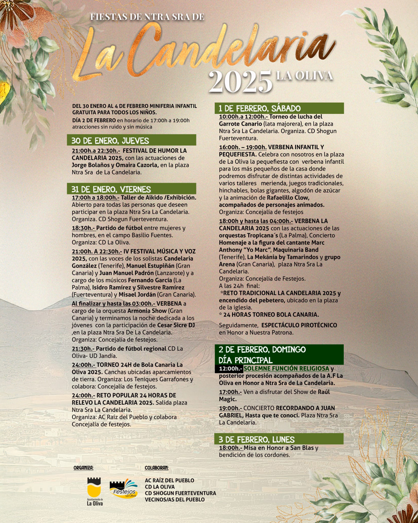 Las Fiestas de Nuestra Señora de La Candelaria 2025 llegan a La Oliva con una programación diversa que se desarrollará del 30 de enero al 3 de febrero, ofreciendo actividades culturales, deportivas y festivas para todos los públicos.