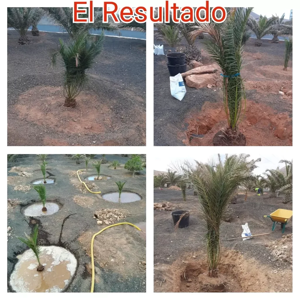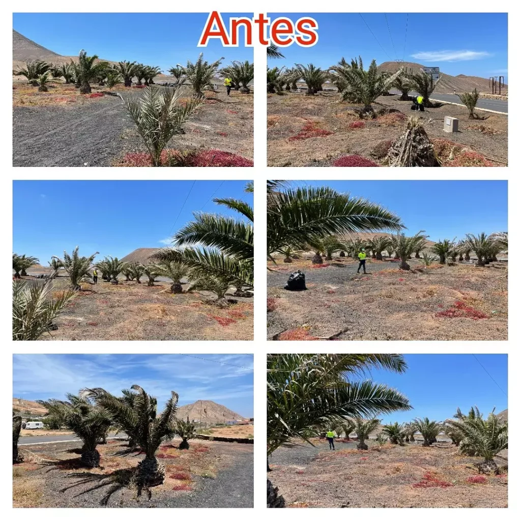 En las fotos adjuntas se puede comprobar el antes y después de las actuaciones en el palmeral de Tindaya, donde se colocará también malla para evitar el crecimiento de malas hierbas. Se proveerá también a la zona de picón negro y se colocará iluminación tal como se ha hecho en el Palmeral entre Villaverde y La Oliva.