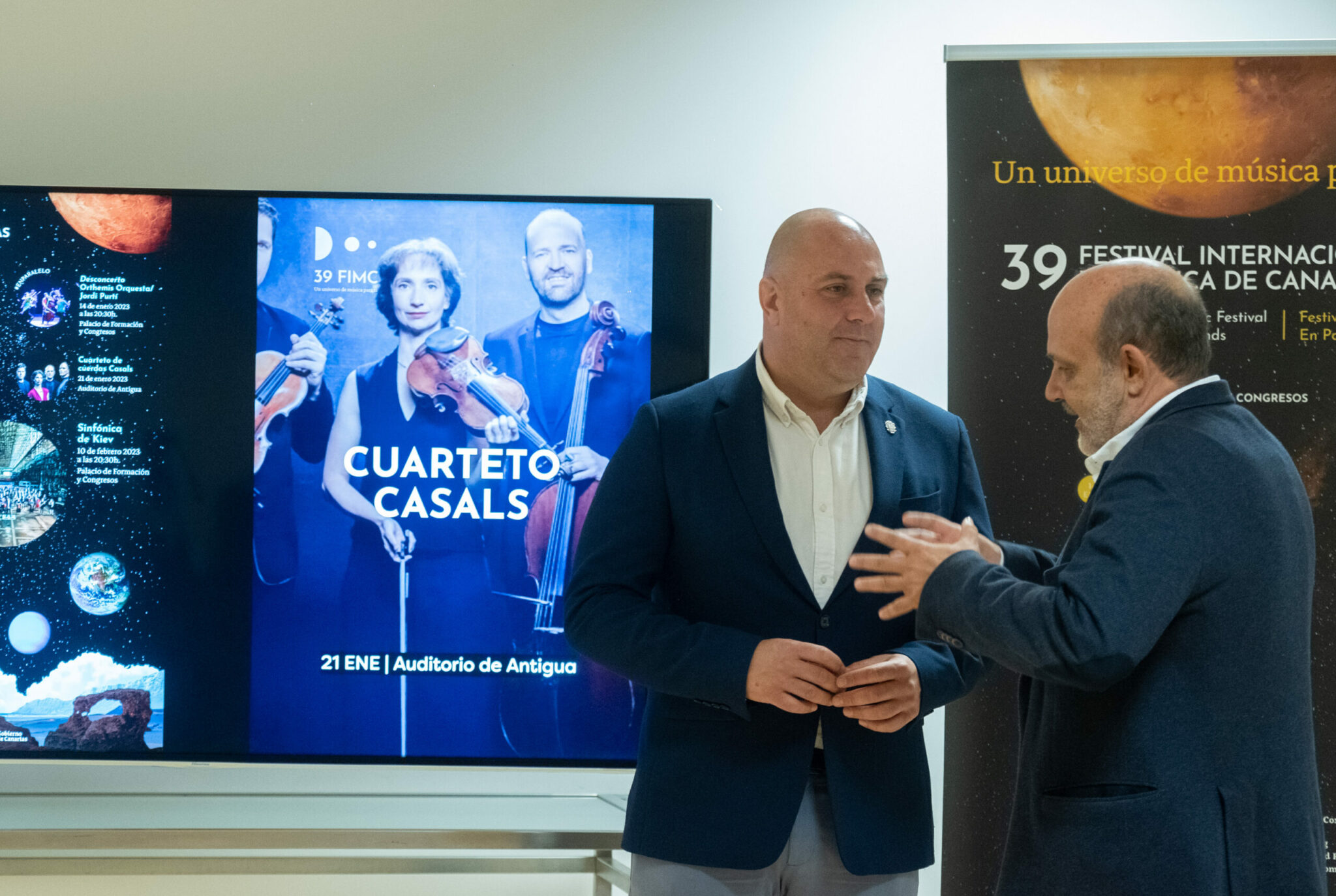 El presidente del Cabildo de Fuerteventura, Sergio Lloret, junto a Jorge Perdigón, director del Festival Internacional de Música de Canarias, han presentado hoy, miércoles 4 de enero de 2023, en el Palacio de Formación y Congresos la 39ª edición en la isla del festival, cuyas actuaciones tendrán lugar desde el día 13 de enero hasta el próximo 10 de febrero.
