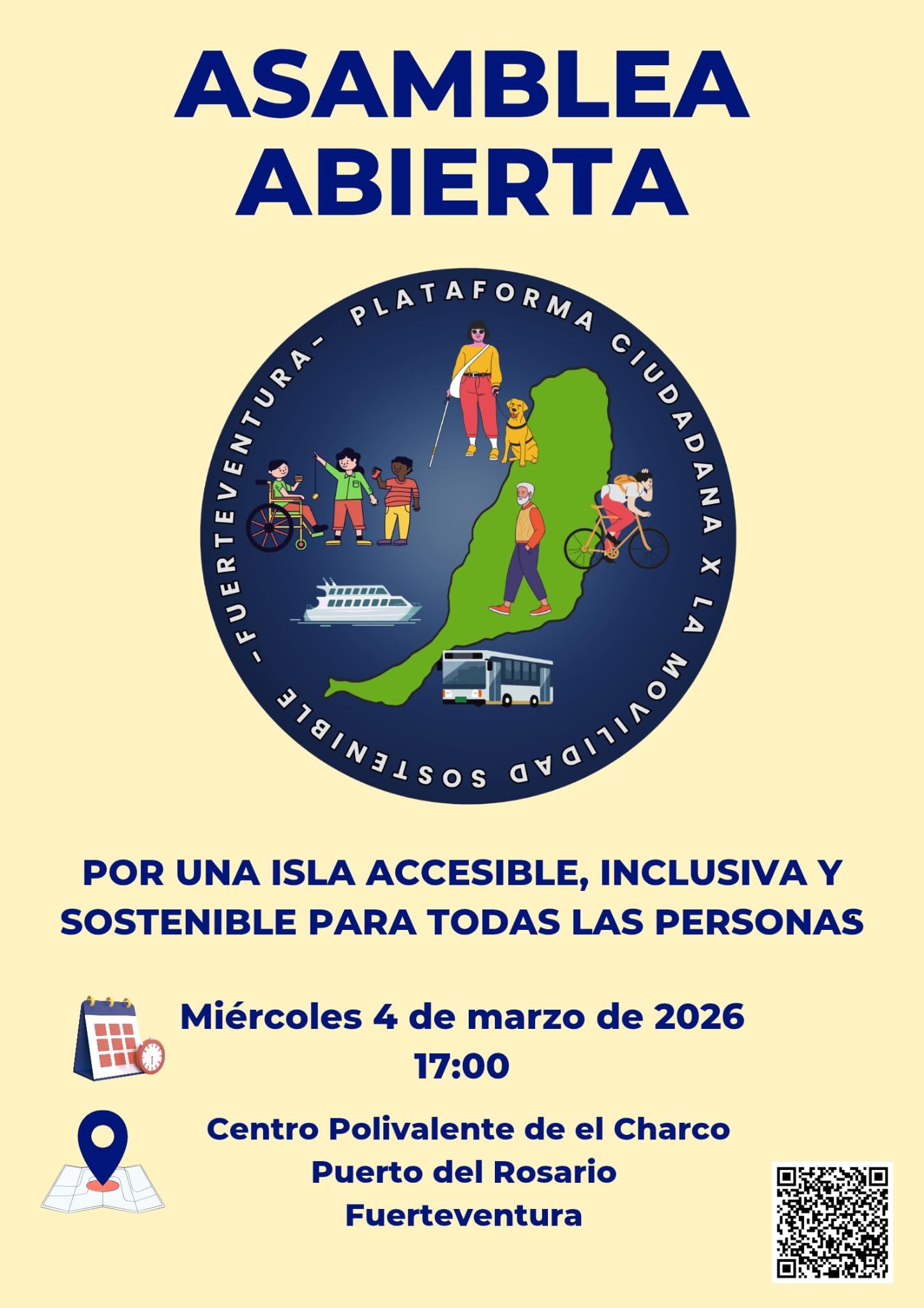 La Plataforma Ciudadana por la Movilidad Sostenible de Fuerteventura ha convocado a la ciudadanía a una asamblea abierta que se celebrará el próximo miércoles 4 de marzo de 2026, a las 17:00 horas, en el Centro Polivalente de El Charco, en Puerto del Rosario, con el objetivo de compartir propuestas y evaluar el estado actual del transporte público, la accesibilidad y la planificación urbana en la capital majorera.