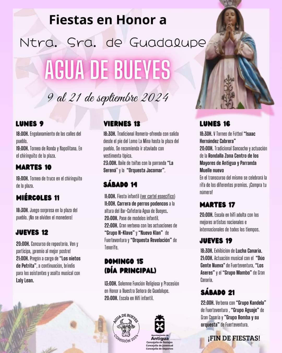 - 22:00h: Gran verbena con las actuaciones de Grupo N-Klave y Nuevo Klan de Fuerteventura y Orquesta Revelación de Tenerife.
