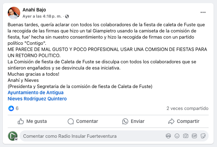 El conflicto estalló cuando, a través de una publicación en Facebook, Anahí y Nieves afirmaron que un miembro del partido, identificado como Giampietro, llevó a cabo la recogida de firmas utilizando una camiseta de la comisión de fiestas sin el consentimiento de esta y en nombre de CONTIGO Fuerteventura. Según ellas, la acción fue percibida como una maniobra política con el fin de obtener beneficios partidistas, algo que consideran inapropiado para una entidad festiva y comunitaria.