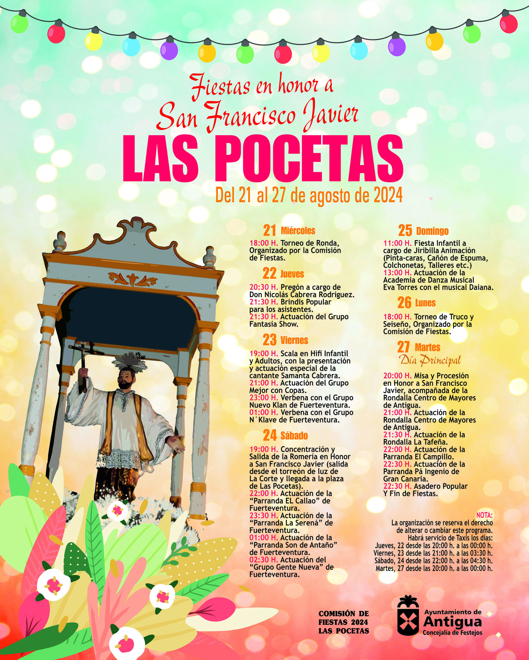 Hoy, sábado 24 de agosto de 2024, las Fiestas de Las Pocetas en honor a San Francisco Javier continúan con una emocionante agenda de actividades que promete entretenimiento y tradición para todas las edades. Las festividades, que comenzaron el pasado jueves con un emotivo pregón a cargo de Don Nicolás Cabrera Rodríguez, han sido recibidas con gran entusiasmo por parte de la comunidad. Durante el pregón, el carismático locutor de Radio Insular, José Francisco Montesdeoca, acompañó a Cabrera, compartiendo con los asistentes divertidas anécdotas que arrancaron más de una carcajada y dieron inicio a las celebraciones con un brindis popular, marcando el inicio de unas fiestas que ya se perfilan como inolvidables.