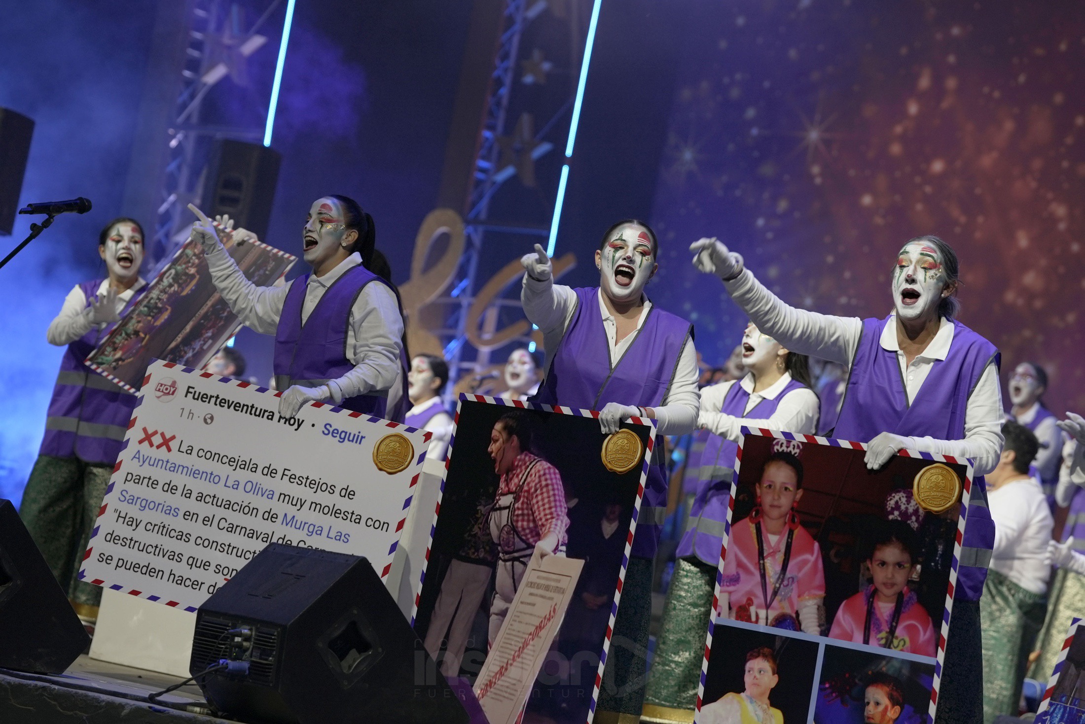 La murga Las Sargoriás subió al escenario del Concurso Insular de Murgas en una noche especial para el grupo, que celebraba su vigésimo aniversario con una actuación marcada por la reivindicación social y la defensa de la identidad canaria. El conjunto de Corralejo firmó una de las intervenciones más completas del certamen, lo que se reflejó después en el acta del jurado, donde obtuvo el primer premio de presentación, el galardón al mejor maquillaje y compartió el premio del público, además de un segundo puesto en interpretación.