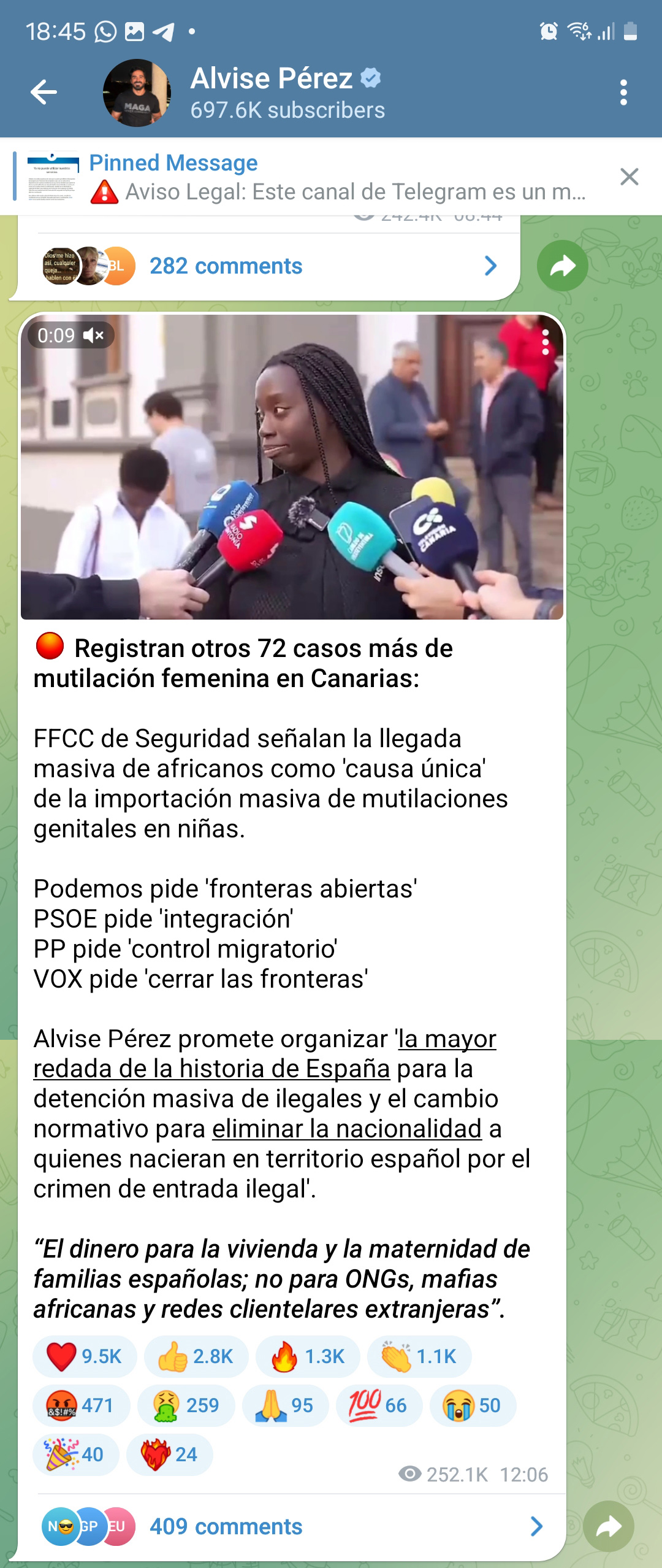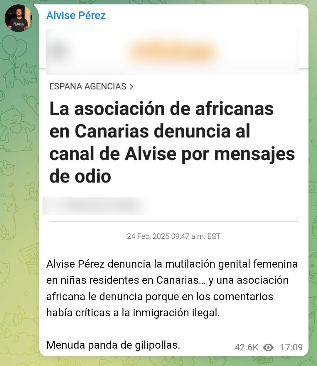 En la publicación del canal de Telegram de Alvise Pérez, donde cuenta con más de 697.000 suscriptores, se afirma que las fuerzas de seguridad identifican la «llegada masiva de africanos» como «causa única» de la importación de la mutilación genital femenina en Canarias. El mensaje, acompañado del vídeo de la joven activista, es acompañado de comentarios políticos en los que se cuestiona la política migratoria y se insta a tomar medidas como la eliminación de la nacionalidad española para personas nacidas en territorio nacional en situación irregular.