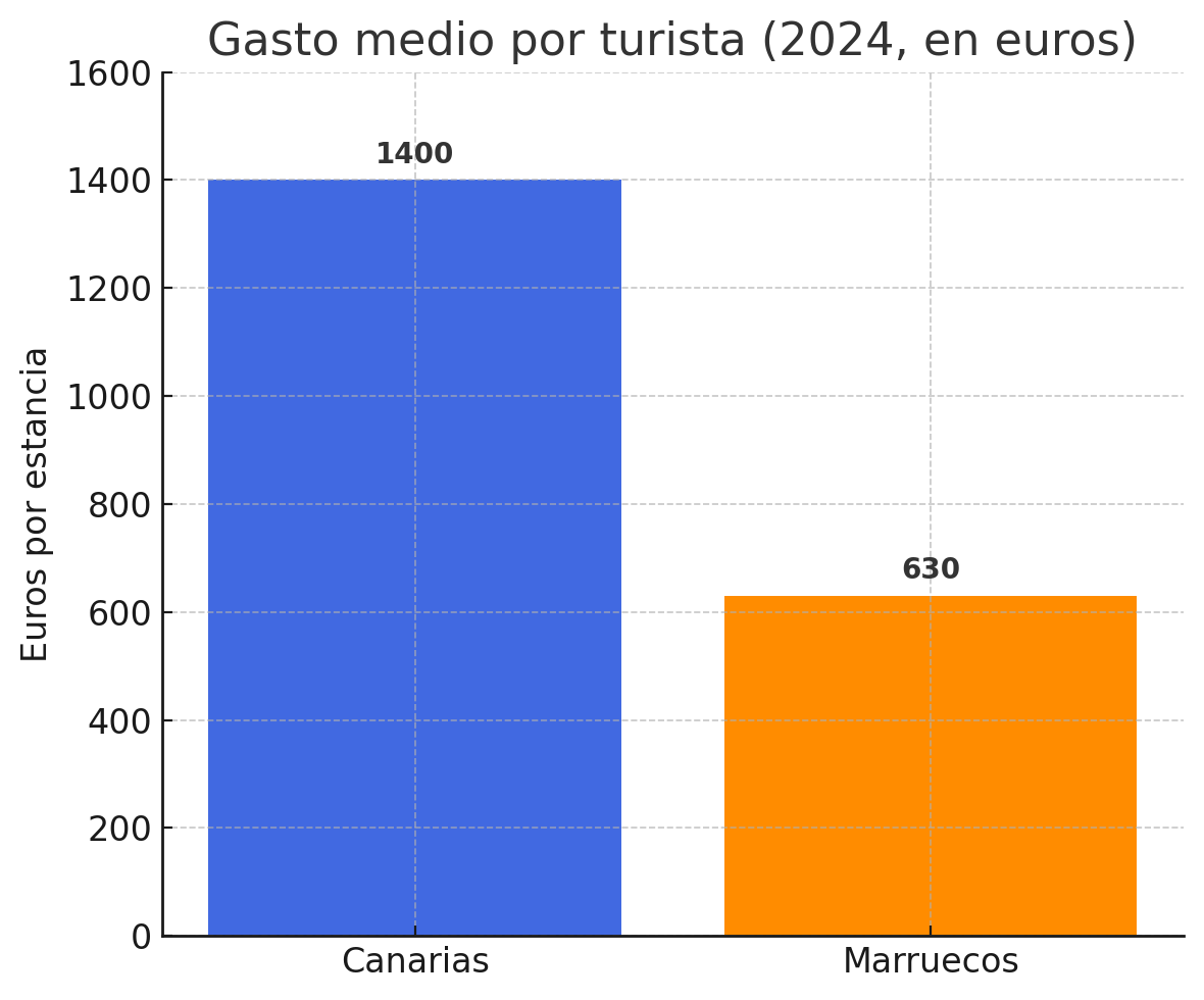 Donde la brecha sigue siendo notable es en el gasto. Según los datos de 2024, el turista medio en Canarias gasta alrededor de 1.400 euros por estancia, frente a los 630 euros en Marruecos. La diferencia se explica por la mayor duración media de la estancia en las islas, el predominio de visitantes europeos con mayor poder adquisitivo y un modelo de turismo de sol y playa con paquetes de mayor valor añadido.