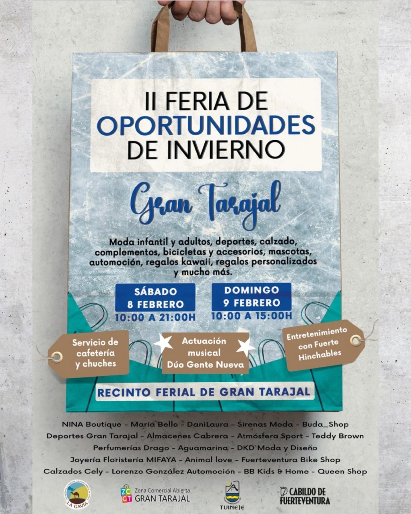 La II Feria de Oportunidades de Invierno de La Gavia se celebrará los días 8 y 9 de febrero de 2025 en el Recinto Ferial de Gran Tarajal, reuniendo a más de 30 comercios locales de sectores como moda, deportes, calzado, complementos, bicicletas, mascotas, automoción y regalos personalizados. Esta feria se consolida como un escaparate para promover el comercio de proximidad y fomentar la interacción entre vecinos y visitantes.