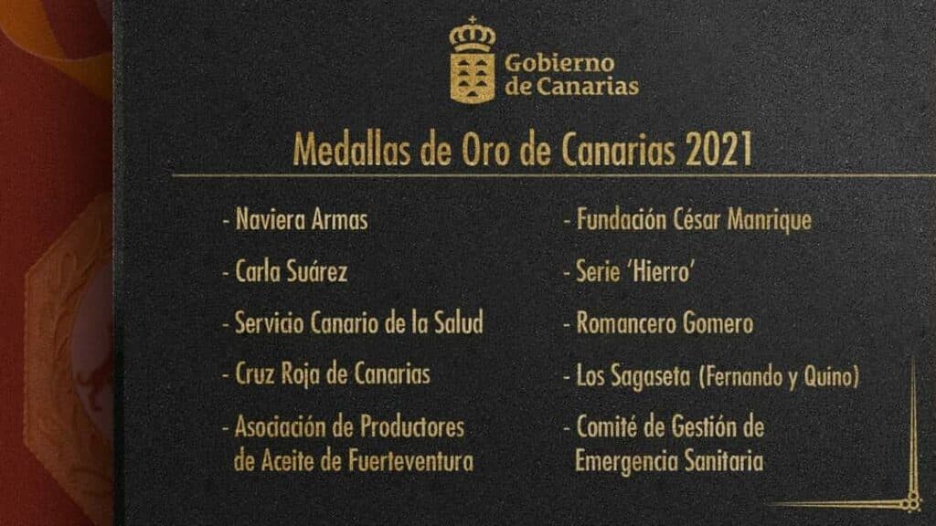 El Gobierno de Canarias dio a conocer ayer martes, 27 de abril, la lista de los galardonados. La Medalla de Oro de Canarias se concede a las personas, corporaciones e instituciones que se hayan hecho merecedoras de este reconocimiento. Se OTORGA por decreto, previo acuerdo del Consejo del Gobierno de Canarias y por iniciativa del presidente de Canarias, por decisión propia o a propuesta del Parlamento de Canarias.