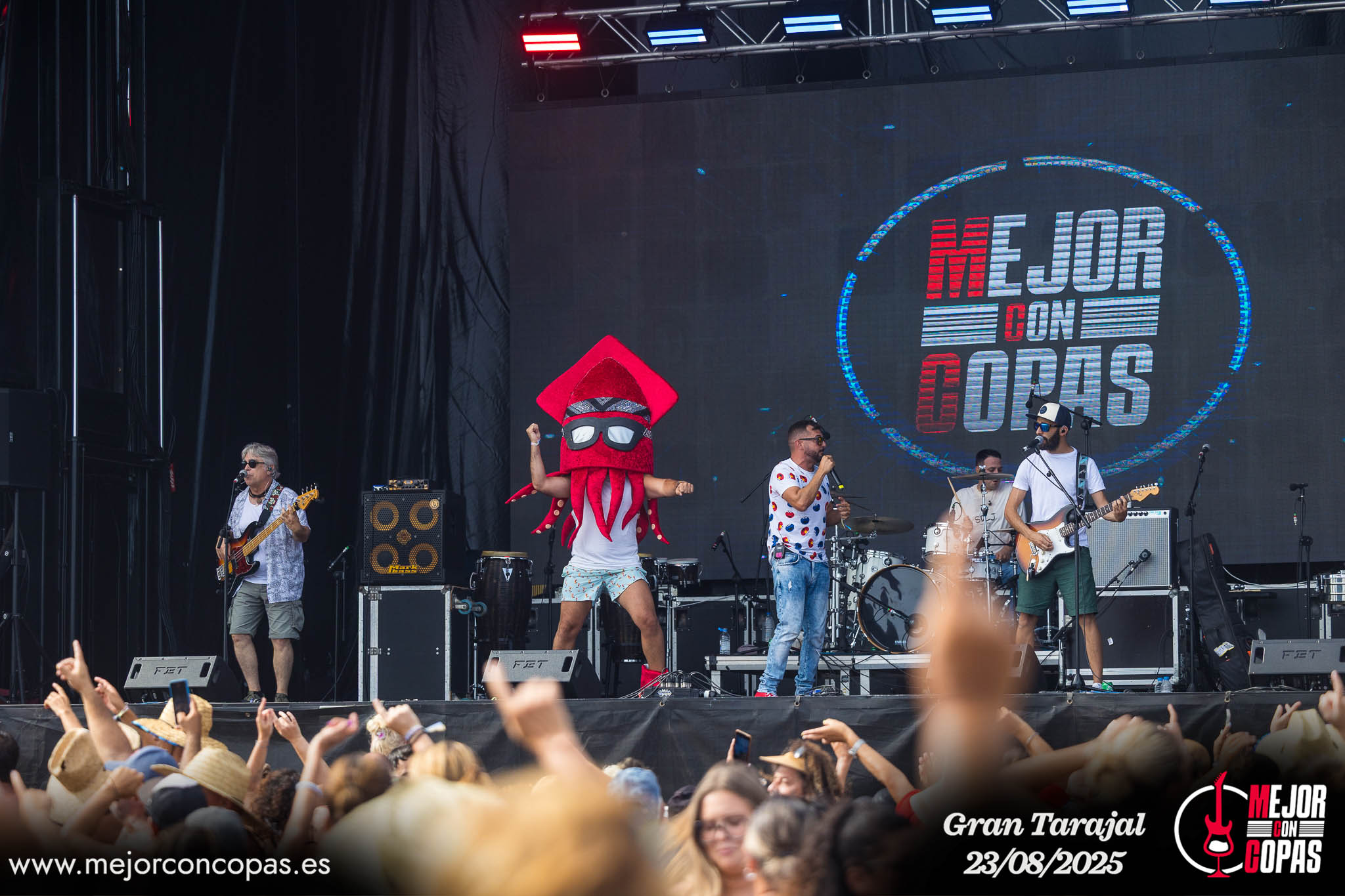Más allá de la música, la conexión con el público ha convertido a Mejor con Copas en una referencia del directo majorero. Anécdotas como la aparición de una mascota en forma de chipirón rojo con gafas y Converse —regalo de una seguidora— han terminado convirtiéndose en iconos de la banda. “Ese detalle no tiene precio. El chipirón ya es casi una mascota oficial, incluso tenemos camisetas con su diseño en nuestra web”, relató el cantante.