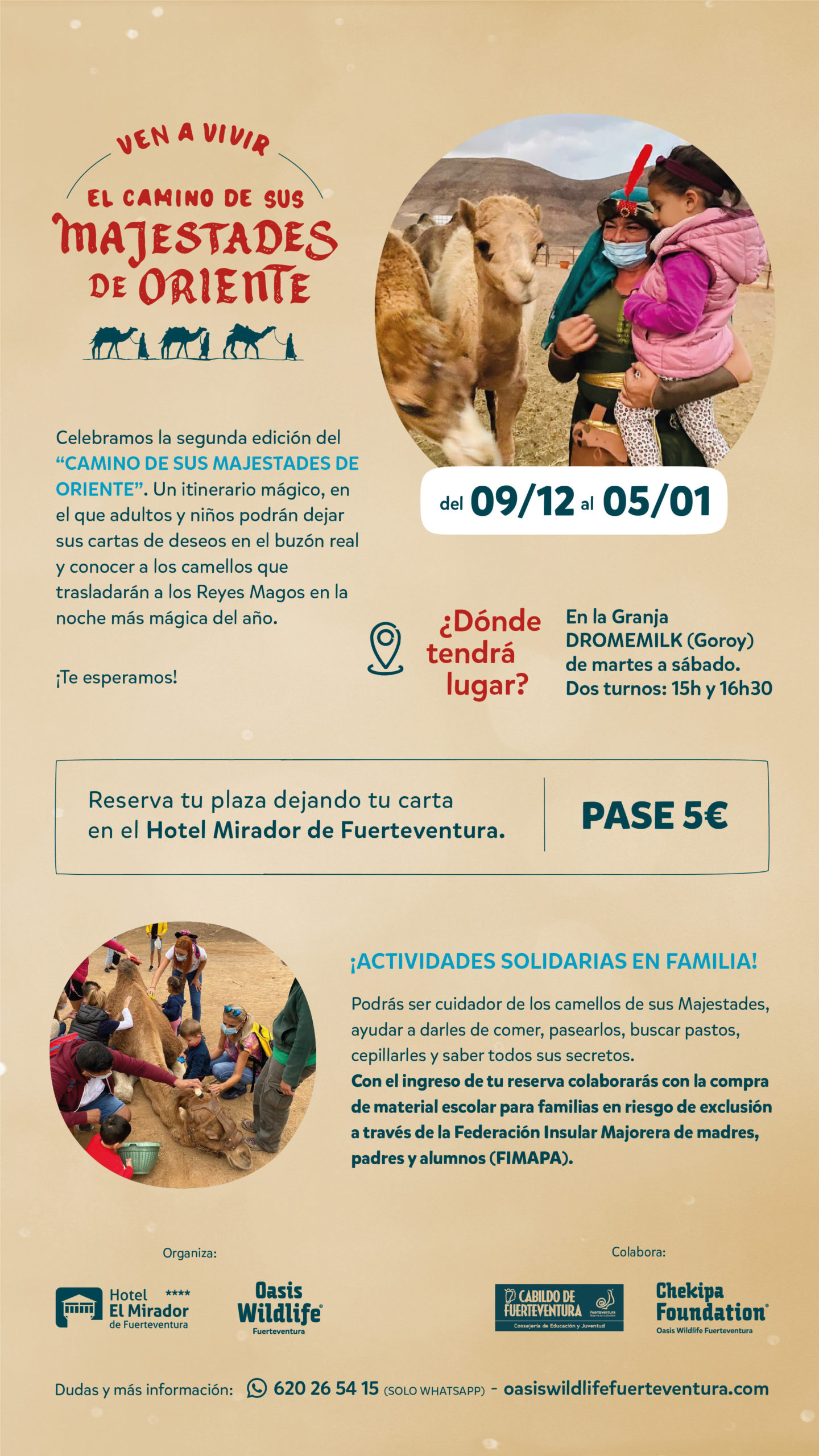 Oasis Wildlife Fuerteventura, la Consejería de Educación del Cabildo de Fuerteventura, el Hotel Mirador, la Fundación Chekipa y FIMAPA (Federación Insular de Madres, Padres y Alumnos ) se han unido este año, para poner en marcha la segunda edición del “CAMINO DE SUS MAJESTADES DE ORIENTE”.