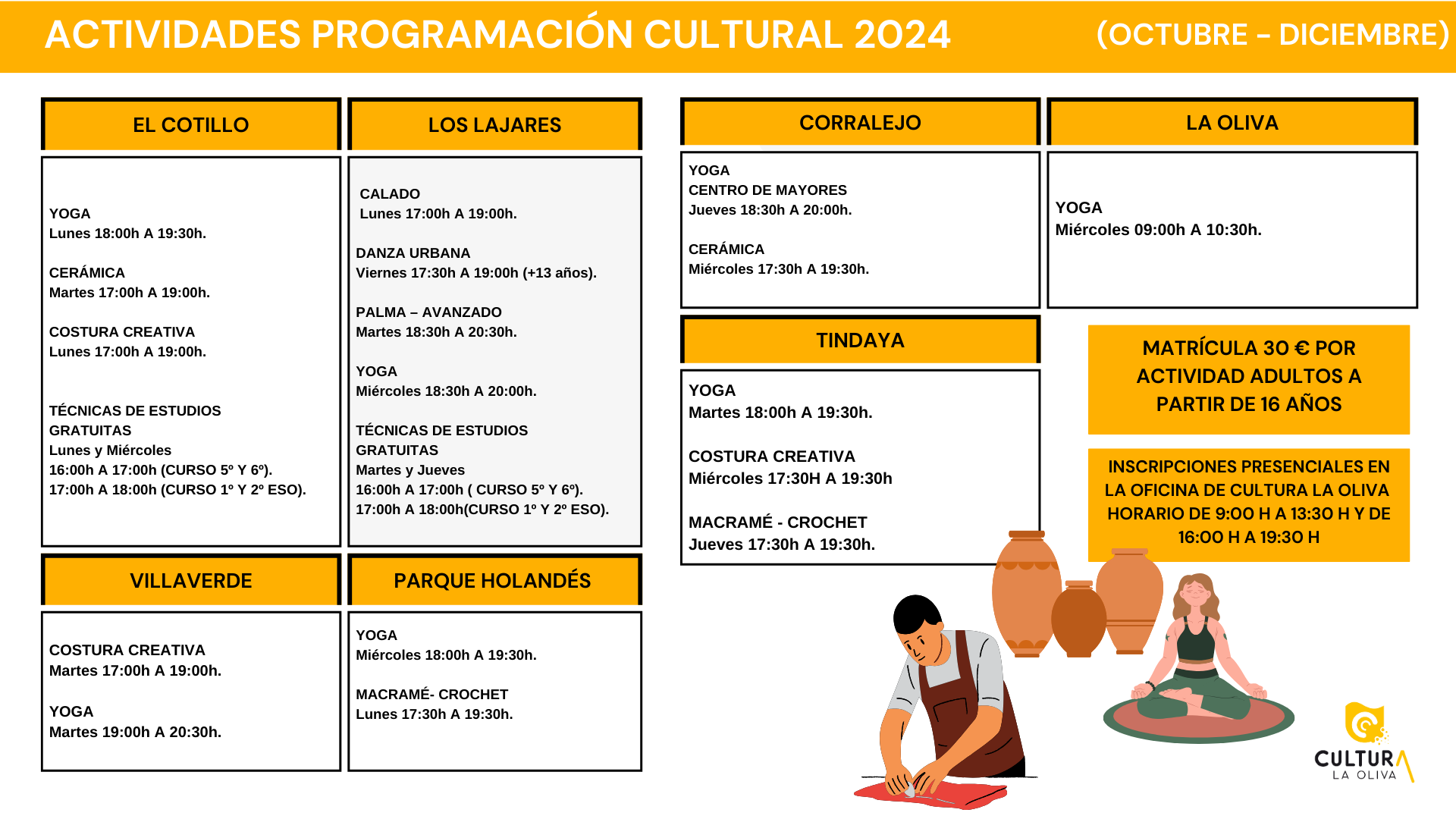Los interesados podrán formalizar sus inscripciones en el departamento de Cultura del Ayuntamiento los días 17 y 18 de septiembre en horario de mañana, de 09:00 a 13:30h, o de tarde, de 16:00 a 19:30h. El coste de cada actividad será de 30 euros por trimestre y deberá abonarse el mismo día que se confirme la admisión al taller. Los detalles sobre el proceso de pago se proporcionarán a cada usuario en el momento de efectuarse el pago.
