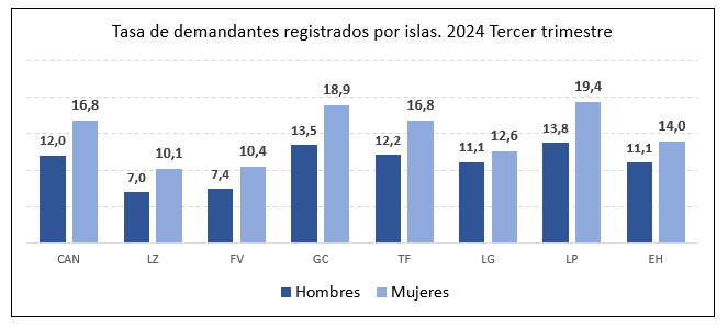 Un análisis detallado revela una brecha de género significativa en las tasas de demandantes registrados en varias islas, con una mayor prevalencia de desempleo entre las mujeres. La diferencia es especialmente notable en La Palma y Gran Canaria, donde la tasa de desempleo femenino supera a la masculina en más de cinco puntos porcentuales.