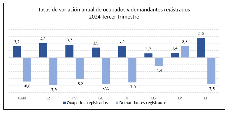 En cuanto a la variación de demandantes registrados, el desempleo bajó en todas las islas, excepto en La Palma. Lanzarote, El Hierro, Gran Canaria y Tenerife registraron las mayores disminuciones anuales en el número de demandantes, con caídas superiores al 7%.