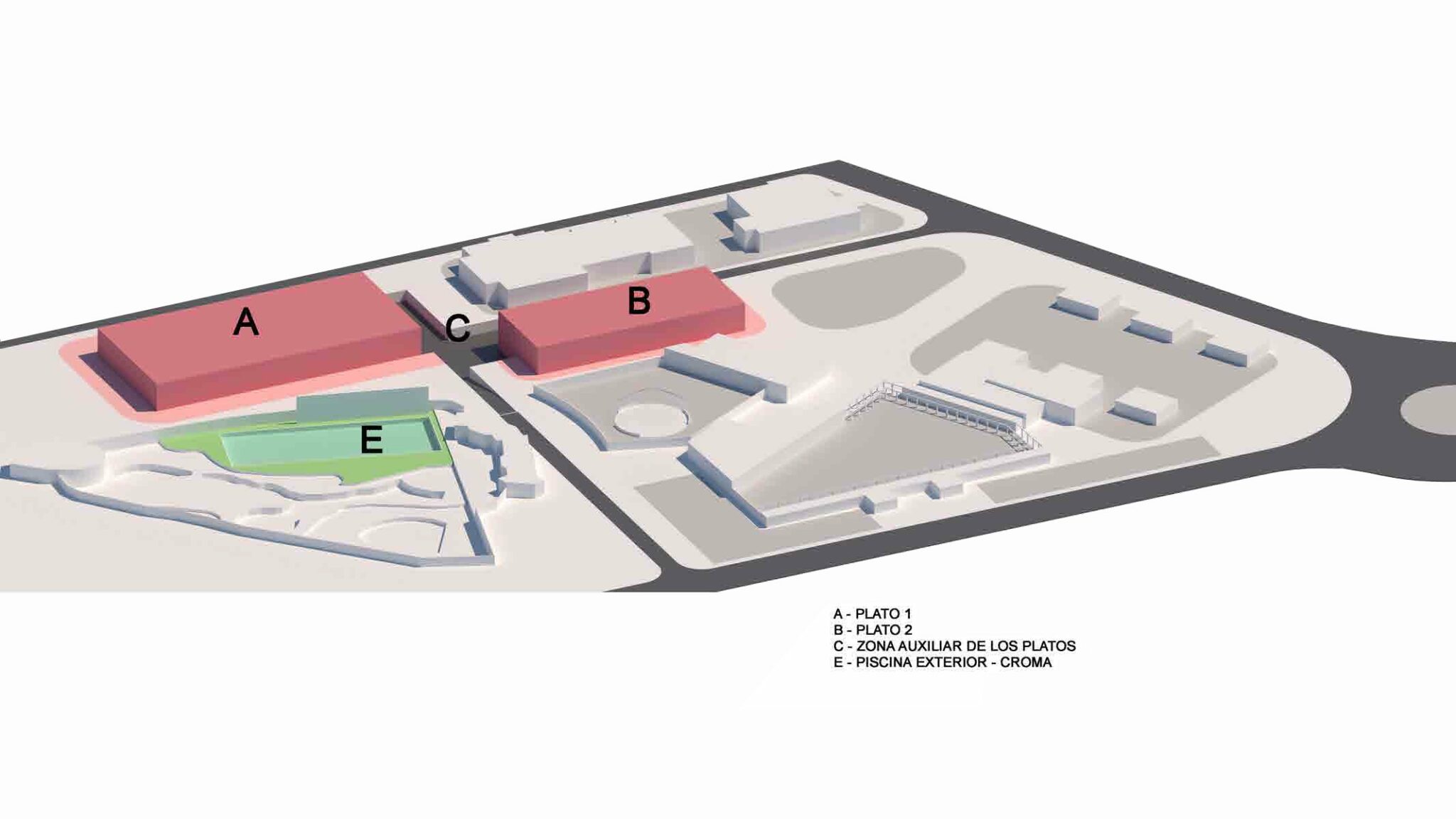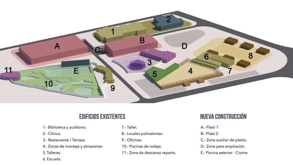 De nueva construcción serían los dos platós de rodaje interconectados entre sí con más de 11.100 metros cuadrados, zonas dedicadas al rodaje de cine, televisión y publicidad, espacios para servicios auxiliares para la postproducción, desarrollo tecnológico, alquiler de equipos de cámara, iluminación y sonido, montaje y mezclas, “incluso salas de proyección con tecnologías avanzadas”.