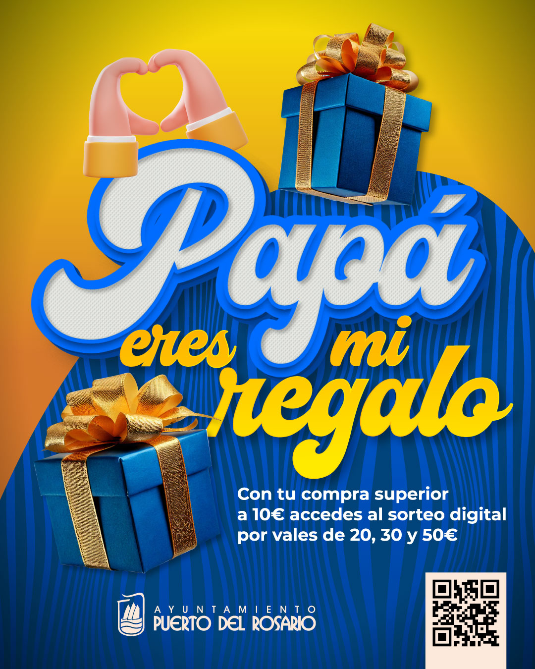 El Ayuntamiento de Puerto del Rosario, en colaboración con los comercios del municipio, lanza la campaña “Papá, eres mi regalo”, una iniciativa que busca fomentar el consumo en los establecimientos locales coincidiendo con la celebración del Día del Padre. La acción promocional premiará las compras con vales de compra por un total de 1.500 euros, repartidos a través de una ruleta digital interactiva accesible desde un QR que estará dispuesto en los comercios adheridos.