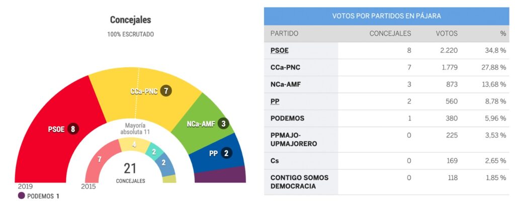Hasta la fecha el pacto en el Ayuntamiento de Pájara estaba conformado por AMF (2), NC (1), PSOE (8) y Podemos (1). En la oposición figuraban los concejales de CC (7) y PP (2).