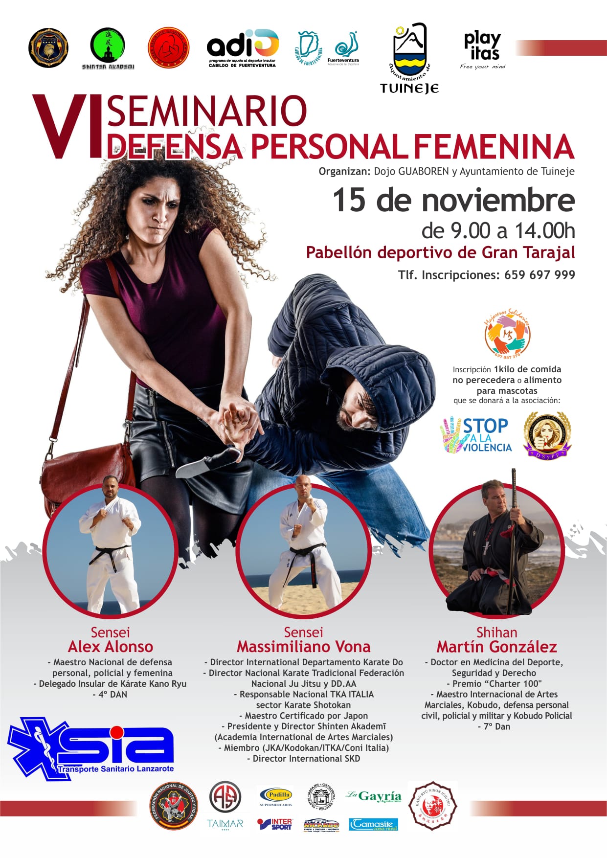 El Pabellón Deportivo de Gran Tarajal acogerá el próximo 15 de noviembre, de 09:00 a 14:00 horas, el VI Seminario de Defensa Personal Femenina, organizado por el Dojo Guaboren y el Ayuntamiento de Tuineje, con la colaboración del Cabildo de Fuerteventura, el programa de ayuda al deporte insular y varias entidades locales.