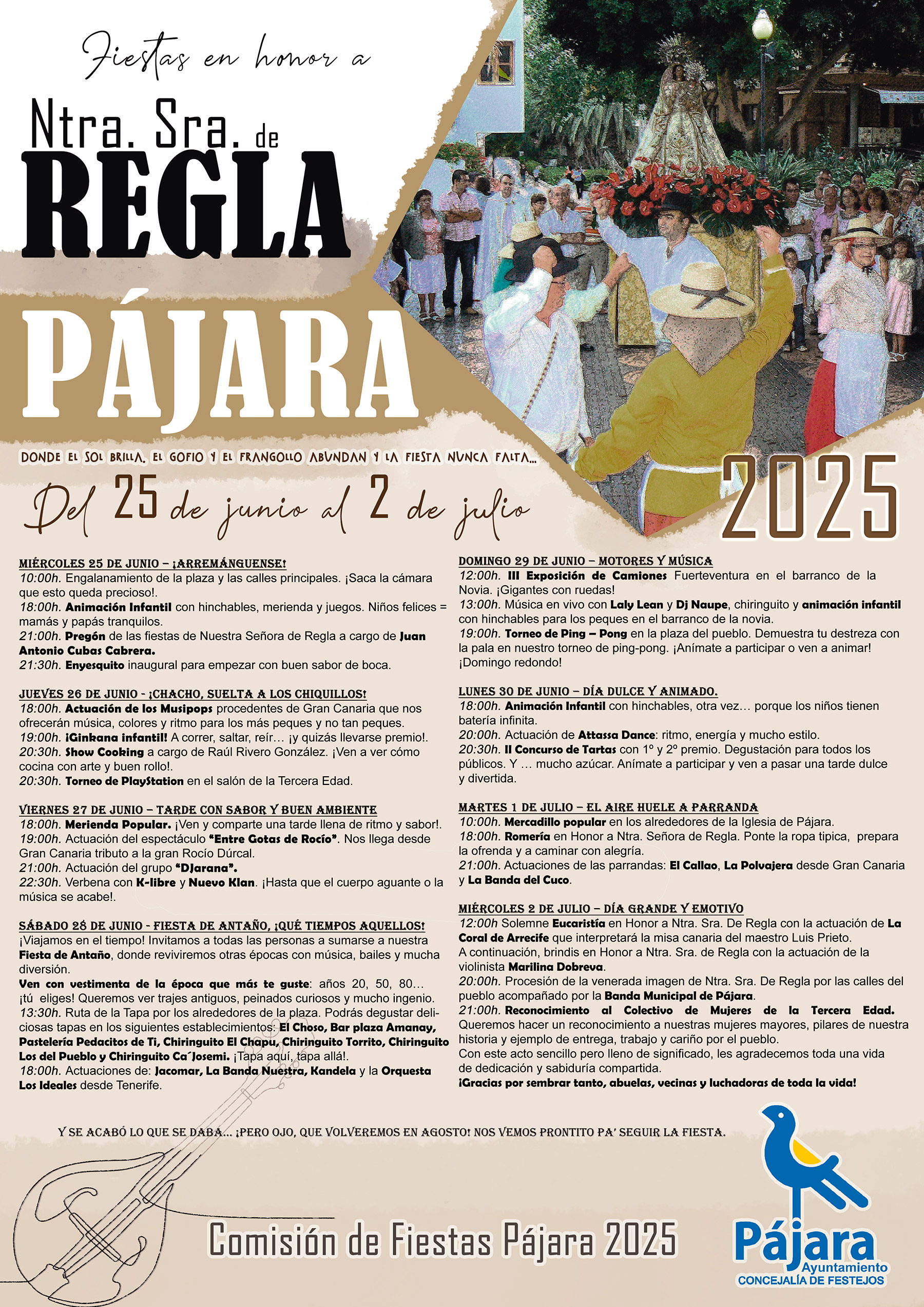 El Ayuntamiento de Pájara, a través de la Concejalía de Festejos, presenta el programa para las fiestas en honor a Nuestra Señora de Regla, que tendrán lugar del 25 de junio al 2 de julio en la localidad de Pájara. La programación combina actos culturales, religiosos y festivos para todos los públicos, desde actuaciones musicales y torneos, hasta mercadillo popular, concursos, verbenas y espacios infantiles.