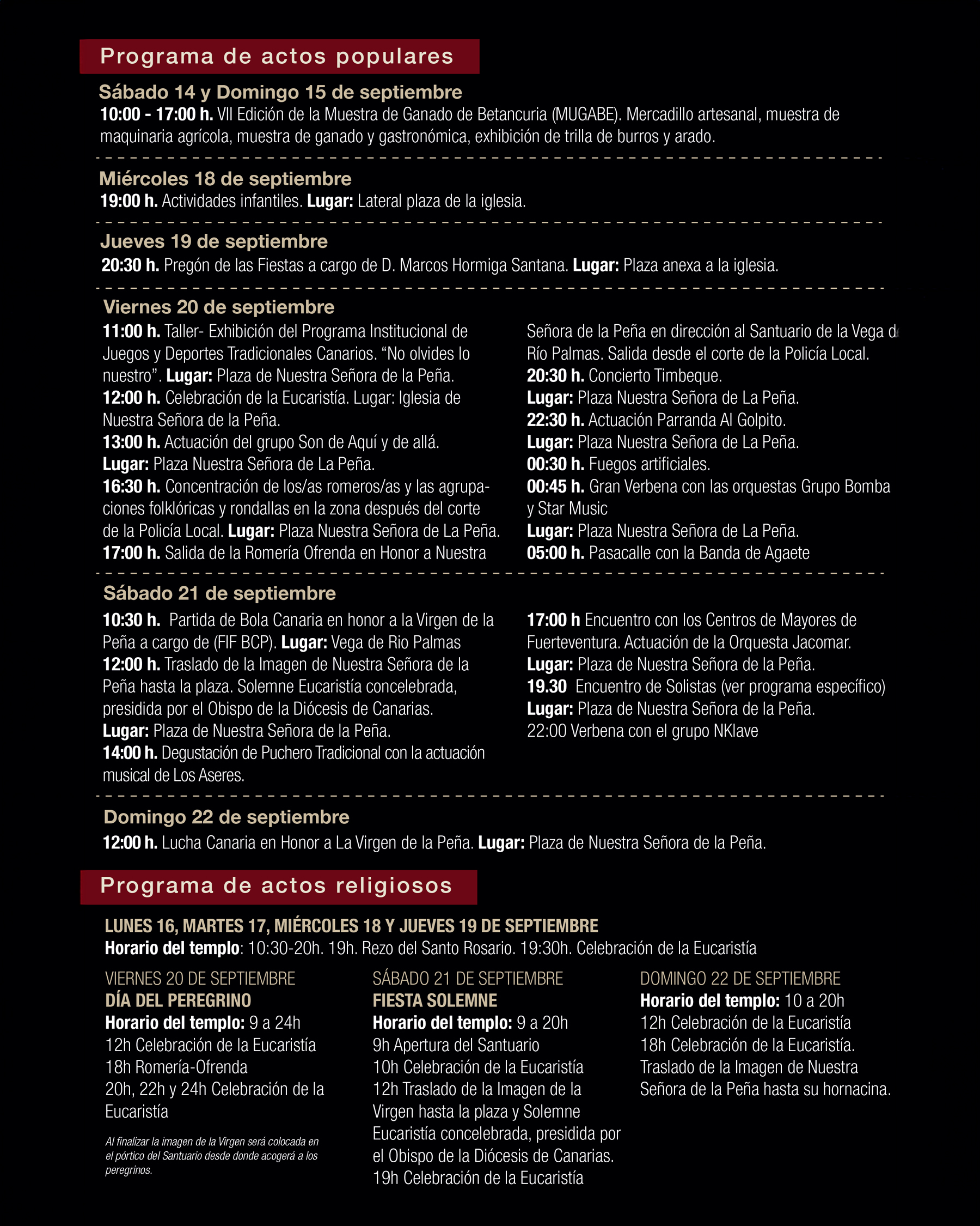 - 17:00 h: La tradicional Romería Ofrenda en Honor a Nuestra Señora de la Peña dará comienzo en la zona señalizada por la Policía Local y recorrerá el Barranco de Betancuria.