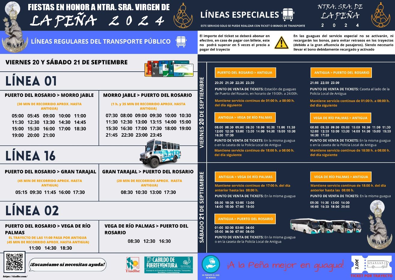 El Cabildo de Fuerteventura, a través de la Consejería de Transporte y Movilidad, dirigida por el consejero Luis González, y la empresa concesionaria del servicio público, Next Continental Holdings, SLU, han establecido una programación especial de guaguas para las Fiestas en Honor a Nuestra Señora de La Peña, que se celebrarán los días 20 y 21 de septiembre.