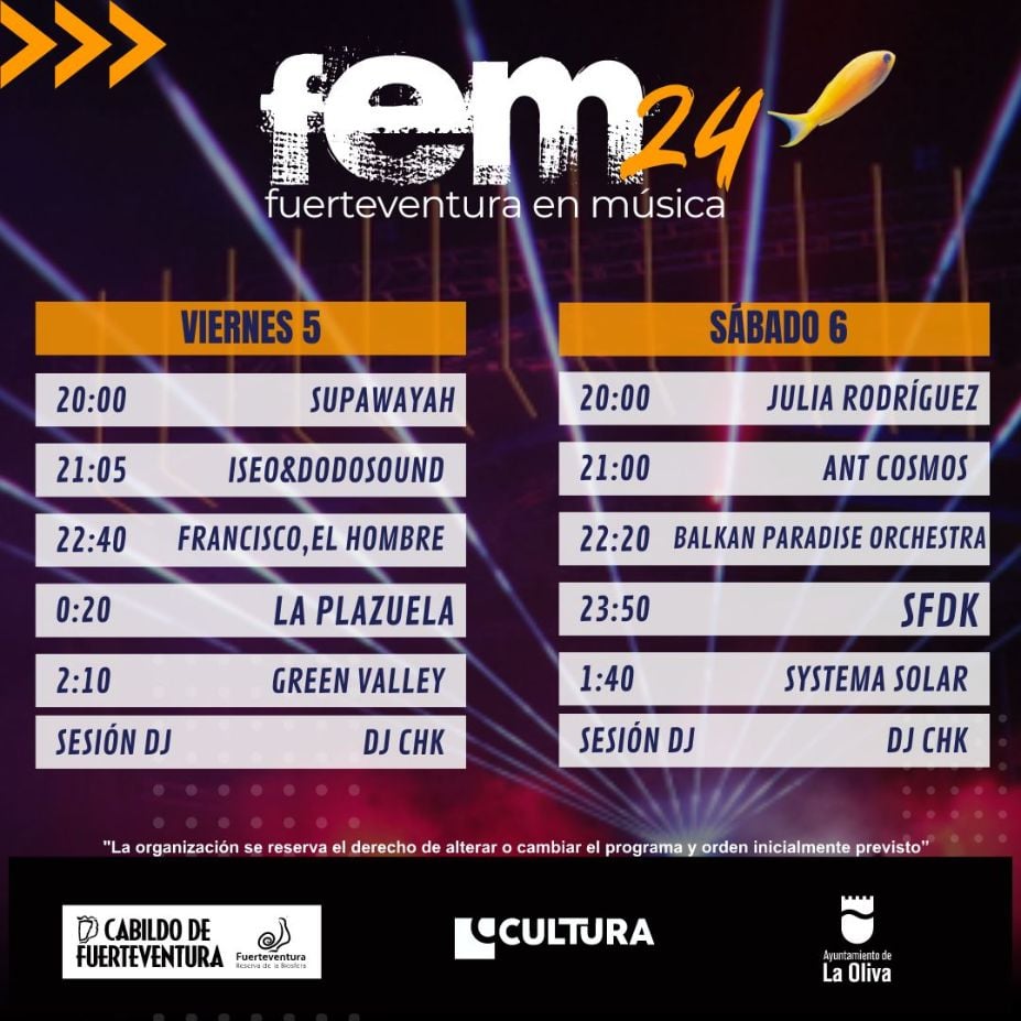 Más de una decena de artistas nacionales, internacionales y locales se subirán los días 5 y 6 de julio al escenario del festival Fuerteventura en Música (FEM) en la Playa de la Concha de El Cotillo. Un cartel con gran variedad de estilos musicales, contando este año con la actriz majorera, Mariam Hernández, como presentadora.