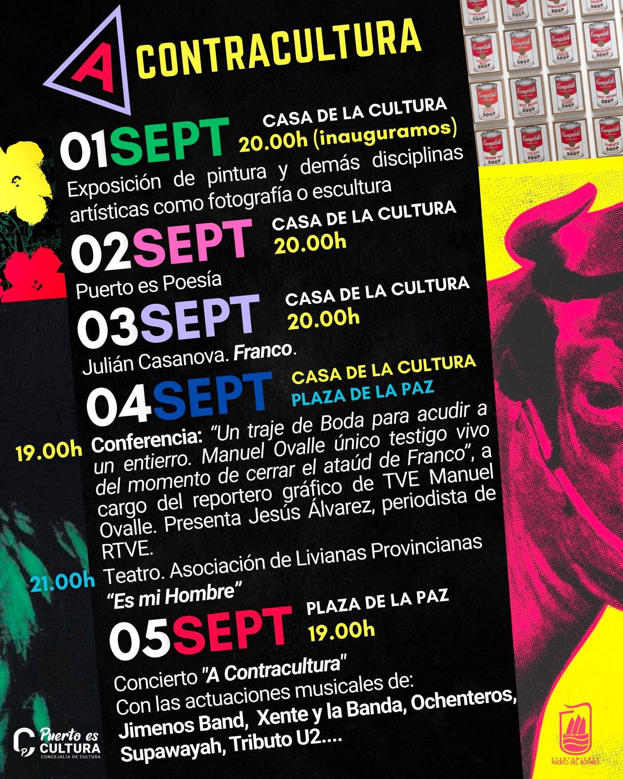 El viernes 5 de septiembre, el Festival A contracultura pondrá el broche a la semana con un gran concierto en la Plaza de la Paz a partir de las 19:00 horas. Sobre el escenario se darán cita Jimenos Band, Xente y la Banda, Ochenteros, Supawayah y Tributo U2, consolidando el evento como un espacio de encuentro cultural y festivo.