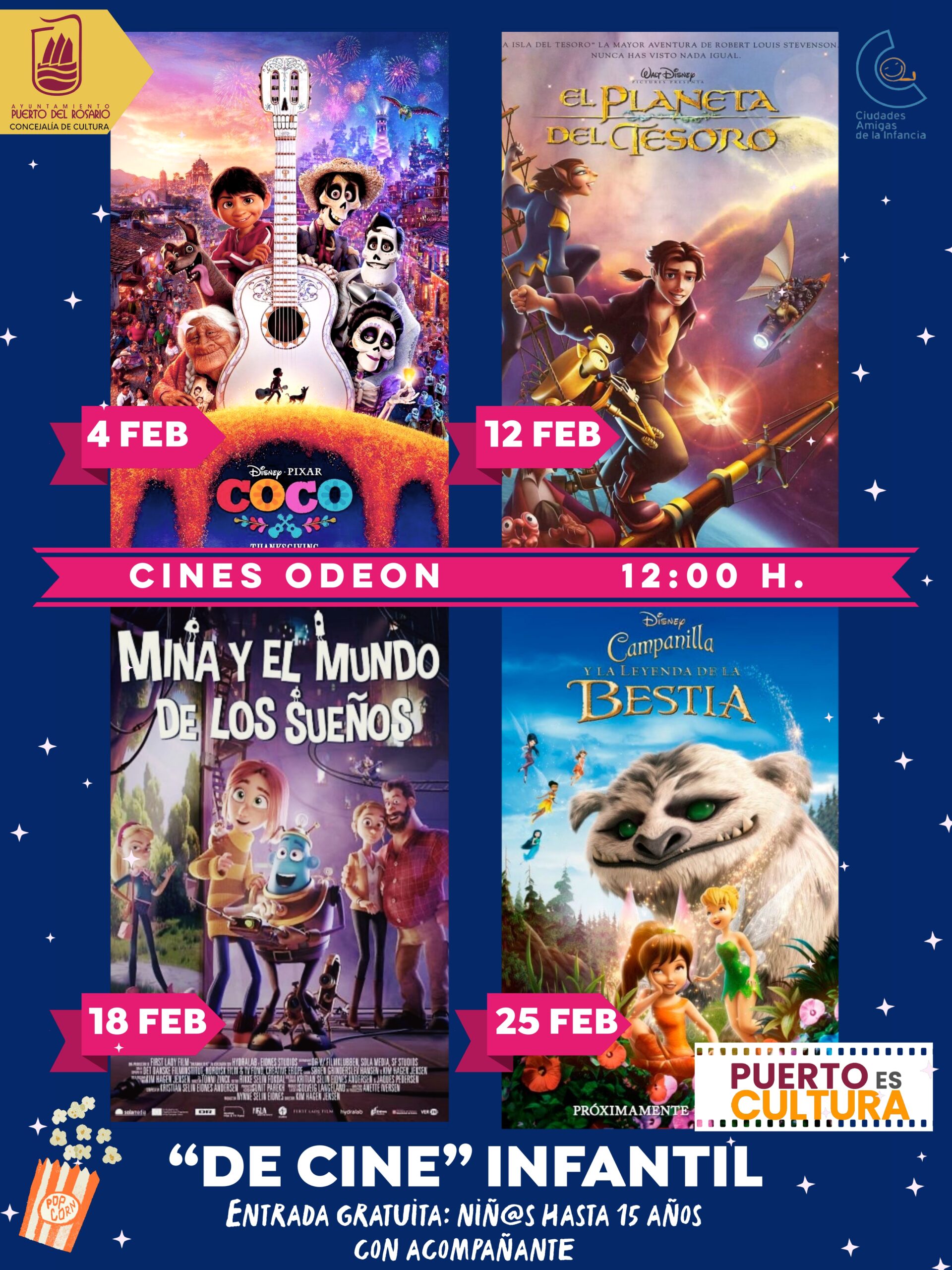 Este sábado, 4 de febrero, se proyectará la primera película dentro del marco de este ‘Ciclo de Cine’: ‘Coco’, seguida de la del próximo 12 de febrero ‘El planeta del Tesoro’, la del 18 de febrero ‘Mina y el Mundo de Los Sueños’, y la del 25 de febrero ‘Campanilla y la leyenda de la Bestia’. Todas las sesiones serán a las 12.00 horas en Cines Odeon.