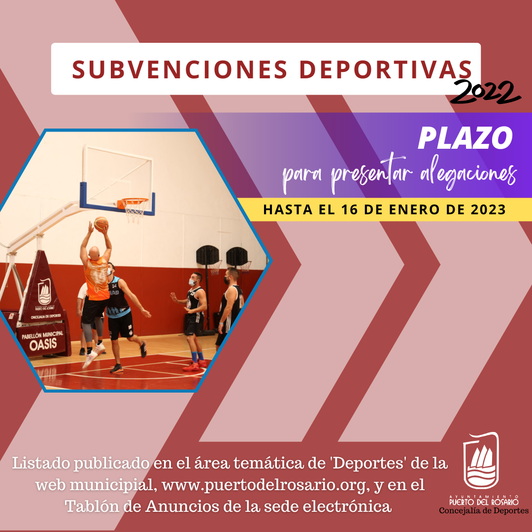 Una vez se ha hecho pública la baremación de las subvenciones deportivas concedidas, la cual está publicada en el área temática de ‘Deportes’ de la web municipal, www.puertodelrosario.org, y en el Tablón de Anuncios de la sede electrónica municipal, aquellas entidades que quieran presentar cuantas alegaciones estimen oportunas, tienen de plazo hasta el próximo 16 de enero para su presentación por Registro de Entrada o registro electrónico.