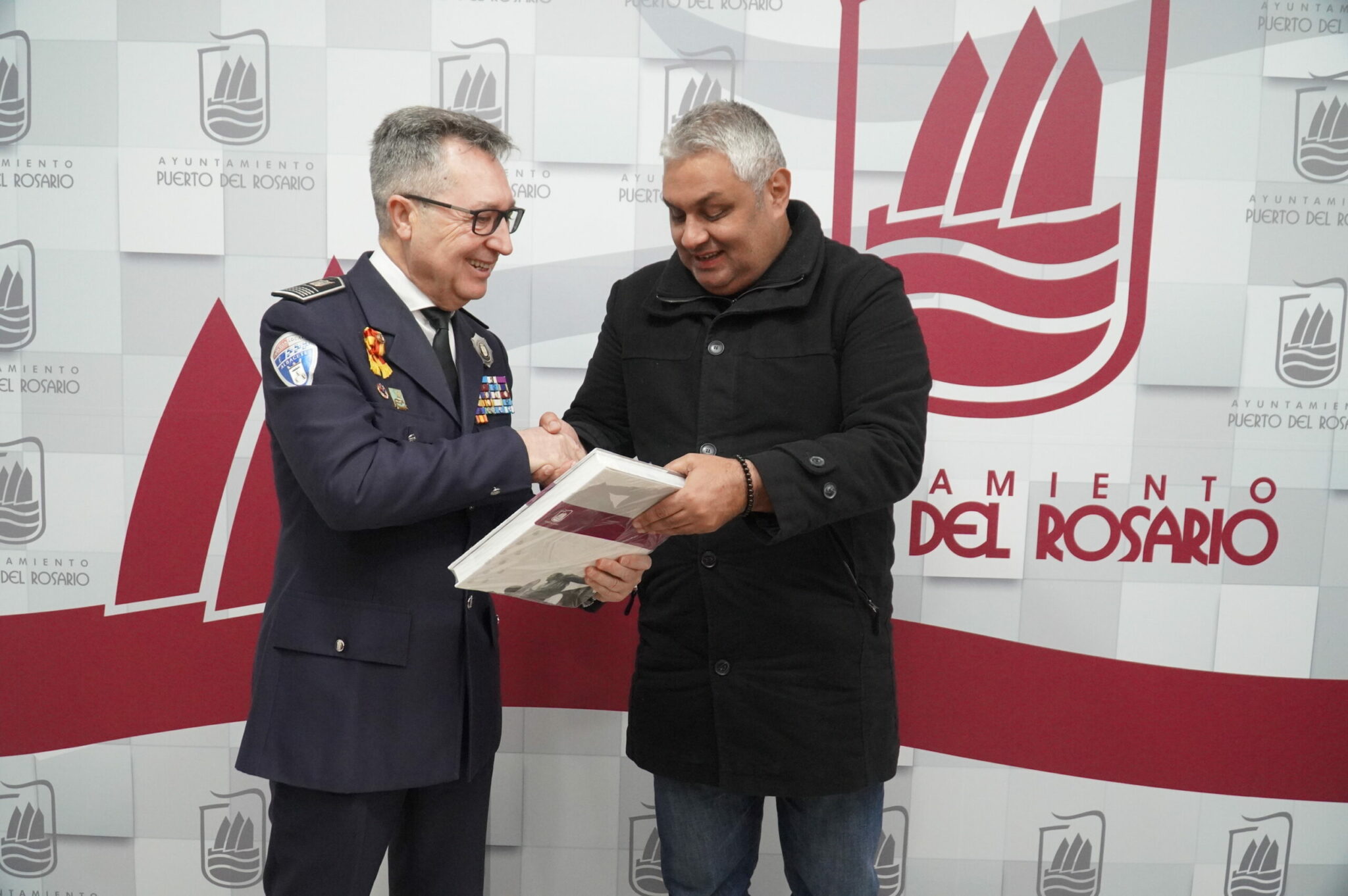 El alcalde capitalino les hizo entrega de un detalle, un libro sobre la historia de Puerto del Rosario al presidente de la UNIJEPOL, Pascual Martínez Cuesta, en reconocimiento a su trabajo a nivel estatal.