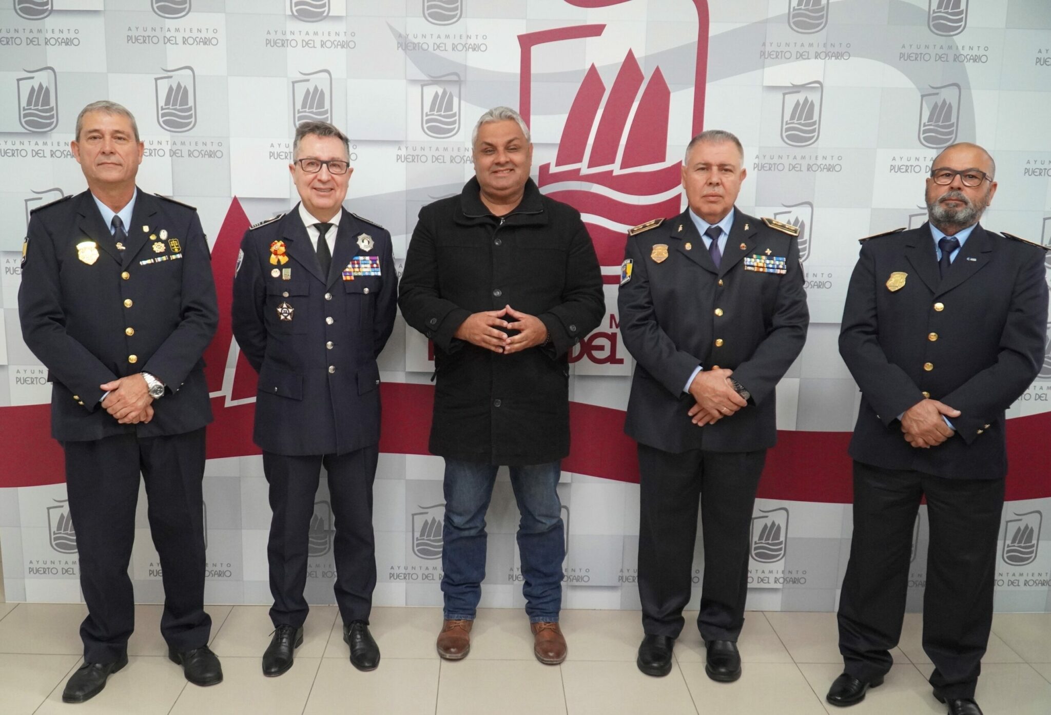 El alcalde del Ayuntamiento de Puerto del Rosario, Juan Jiménez, recibió a primera hora de este jueves en la casa consistorial capitalina a Pascual Martínez Cuesta, presidente de la Unión Nacional de Jefes y Directivos de las Policías Locales (UNIJEPOL), a Pedro Gordillo Cabrera, presidente de la Federación de Jefes de las Policías Locales de Canarias, a José Juan Expósito Delgado, Presidente de AJESPOL Tenerife, y a José Luis Herrera De León, presidente de AJESPOL Las Palmas, a quienes les dio la bienvenida y alabó el trabajo que desempeñan en los diferentes municipios los miembros de este cuerpo de seguridad.